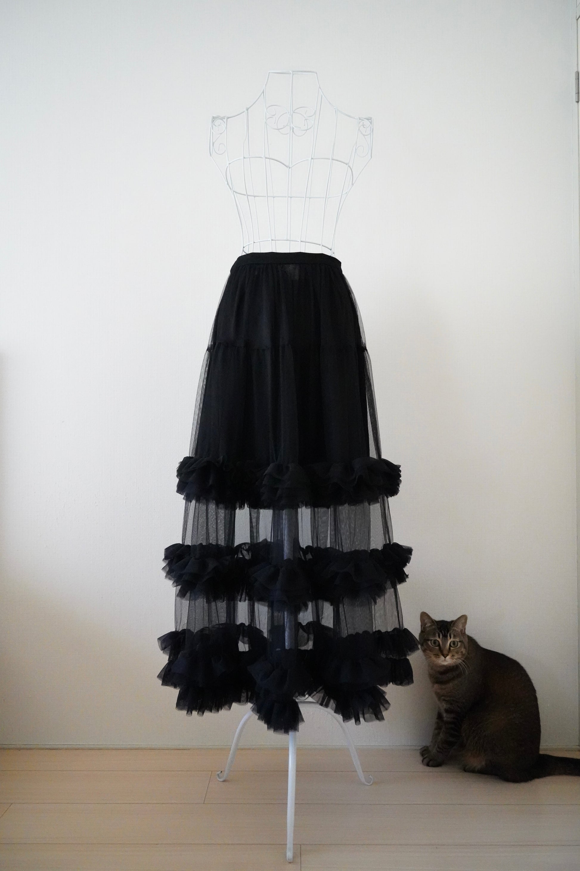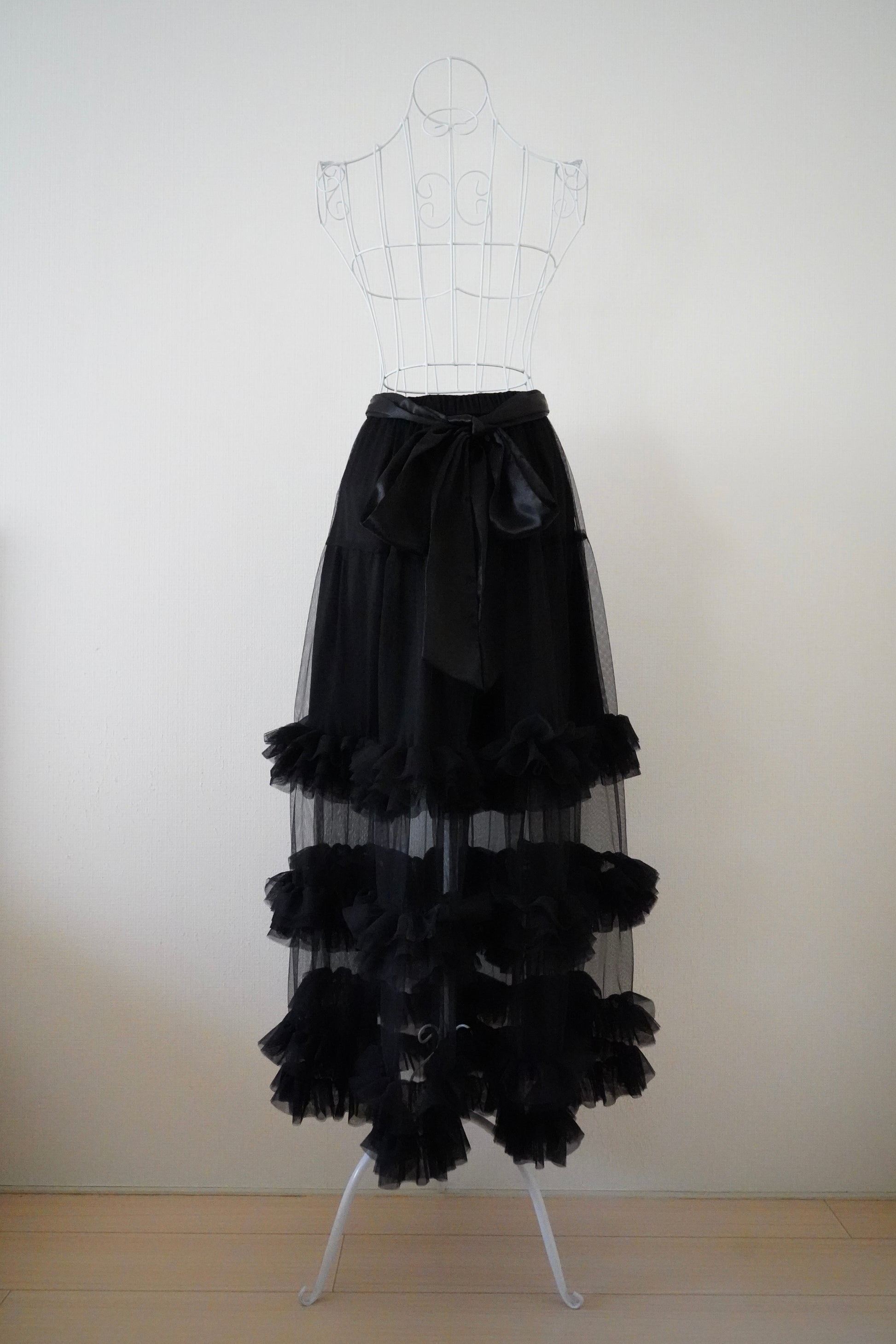 Our Black Swan Long Tulle Skirt is a dreamy black skirt with cascading ruffles with a sparkly ribbon. This elegant piece adds a touch of enchantment to your look, making it perfect for special occasions or whenever you want to twirl in style. The sparkly ribbon in the back allows you to adjust the fit for a comfortable wear. Step into the magic of the Black Swan skirt and let your style glow.