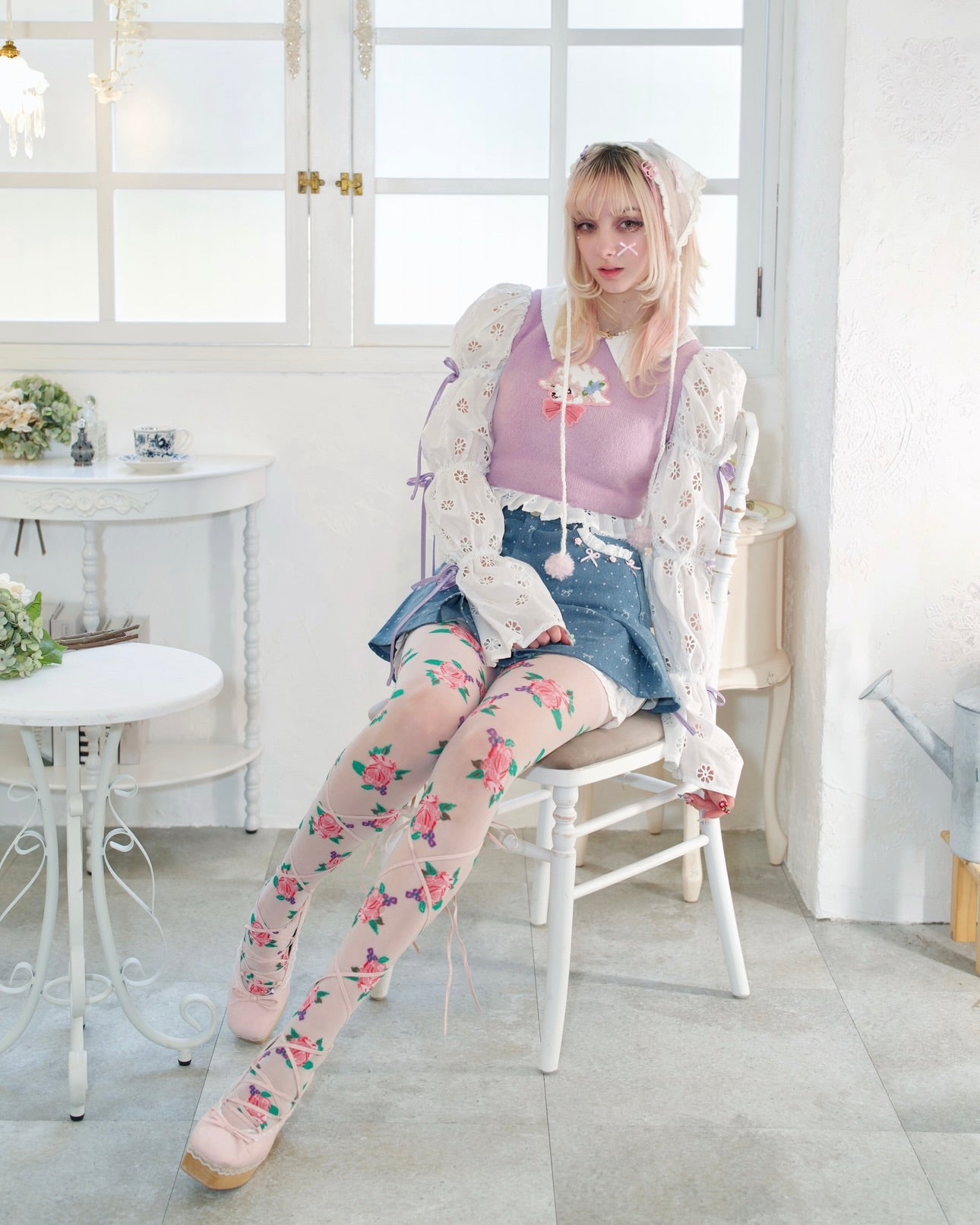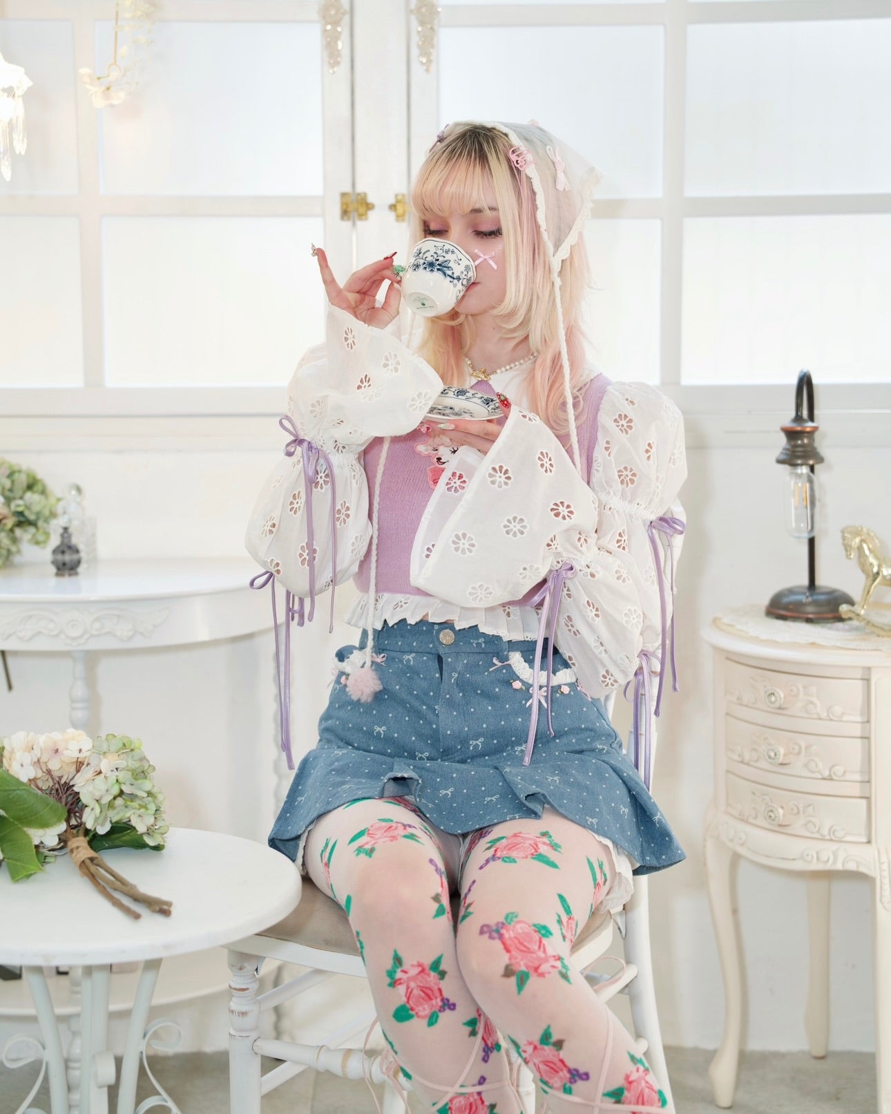 A sweet pastel coloured sweater with cotton bubble sleeves, adorned with dainty satin ribbons. Perfect to style for cute coordinates, as well as casual looks with a touch of cuteness! Featuring a cheeky little sheep patch.