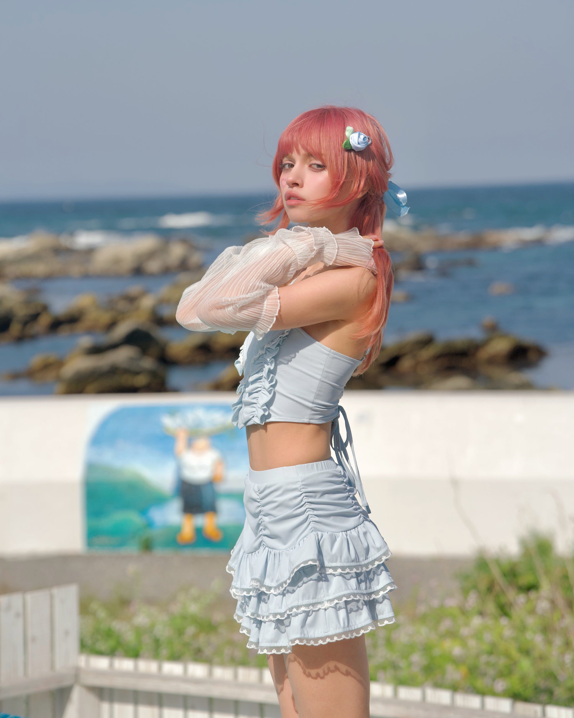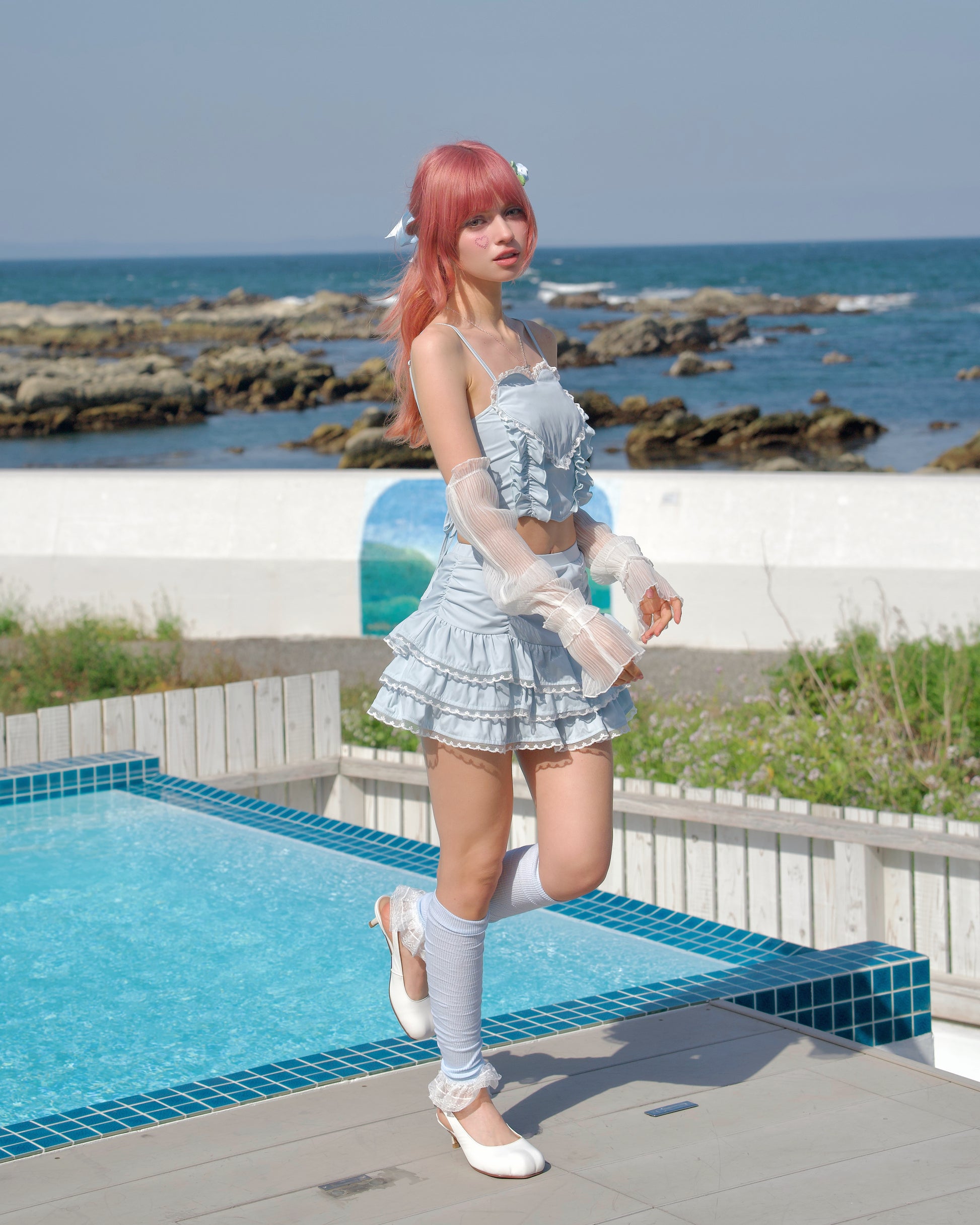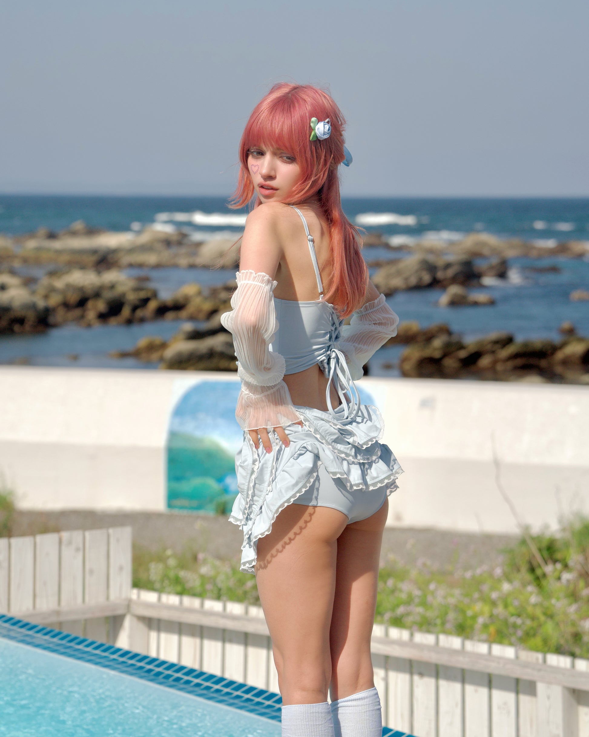 This cute swimsuit set features a heart-shaped cutout with delicate lace around it, giving it a sweet, feminine touch. The bottom has a frilly skirt with built-in swim pants, offering the perfect mix of fun and comfort. Whether you're lounging by the pool or splashing around at the beach, this set will have you feeling cute and carefree.