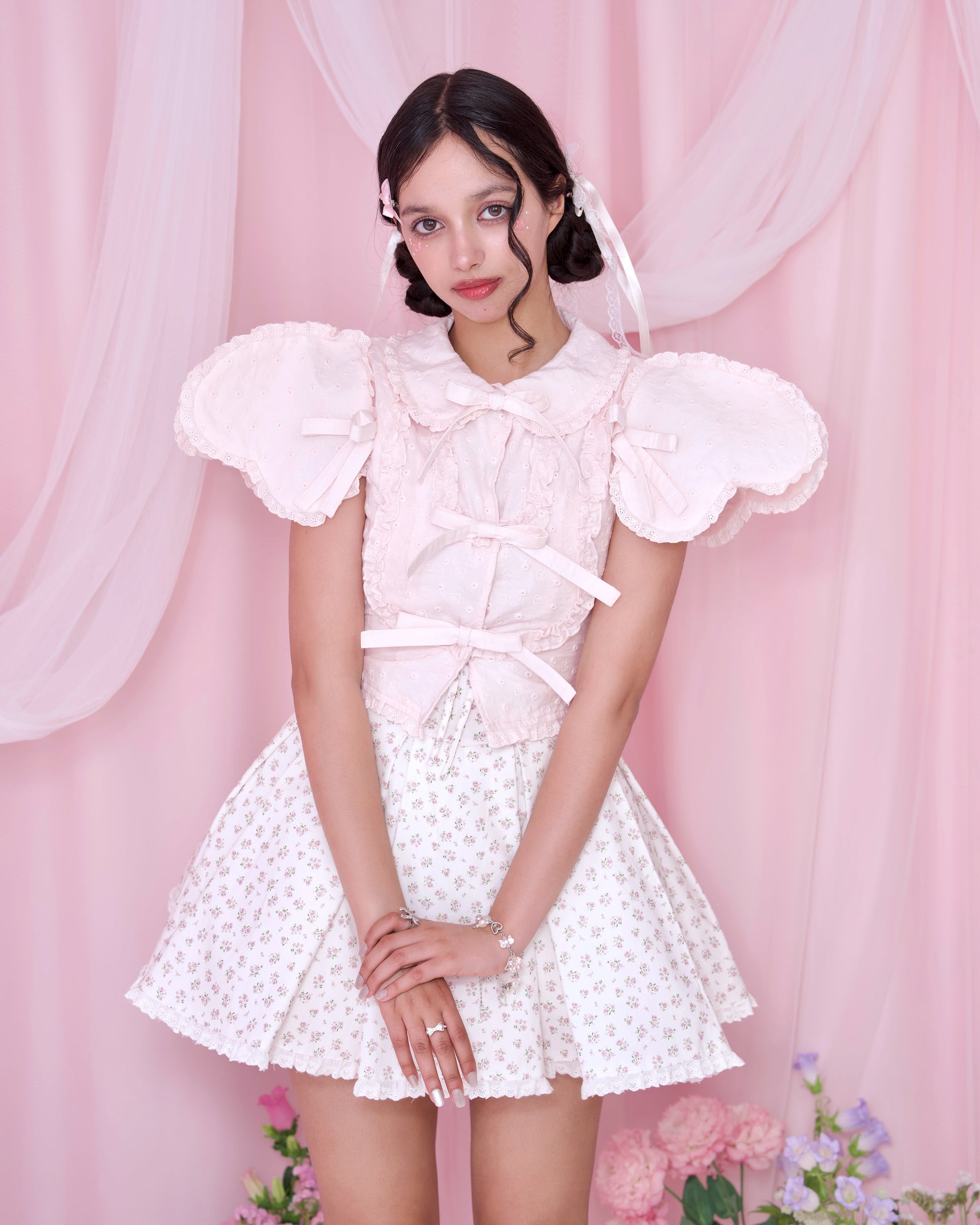 A blouse made for daydreams; with sculpted heart-shaped sleeves that hold their soft silhouette, delicate ribbons that tie at the front, and a lace-up back to shape the waist just right. Made from airy cotton and trimmed with frills, it’s a piece that feels like a love letter to all things sweet and sentimental.