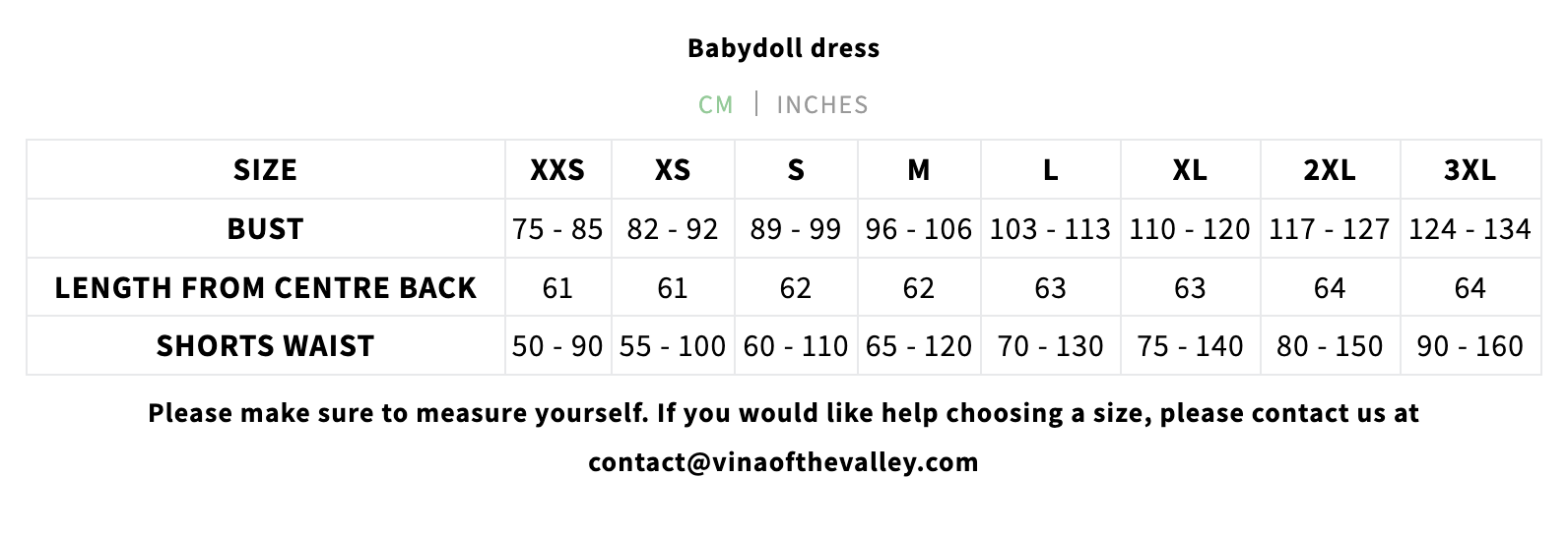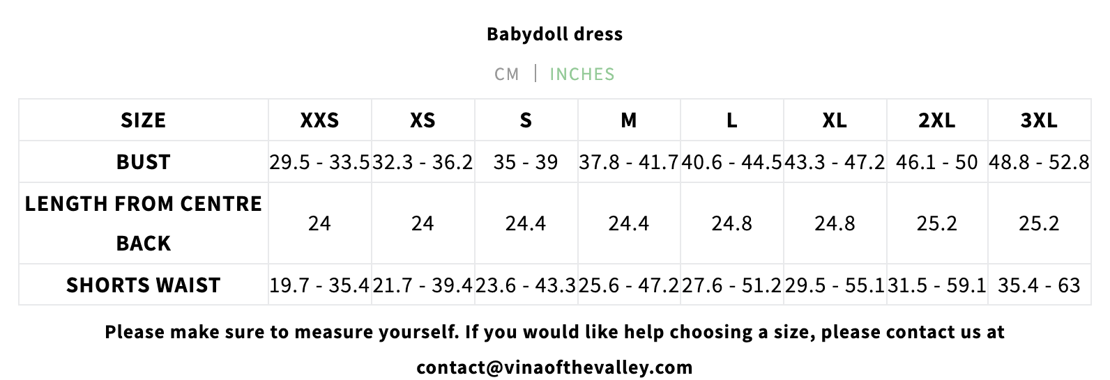 A sweet short babydoll dress with matching fully lined bloomers in every package to accommodate a range of heights, removable cups slipped into the bust, plus a corset-style lace up in the back for just the right fit.