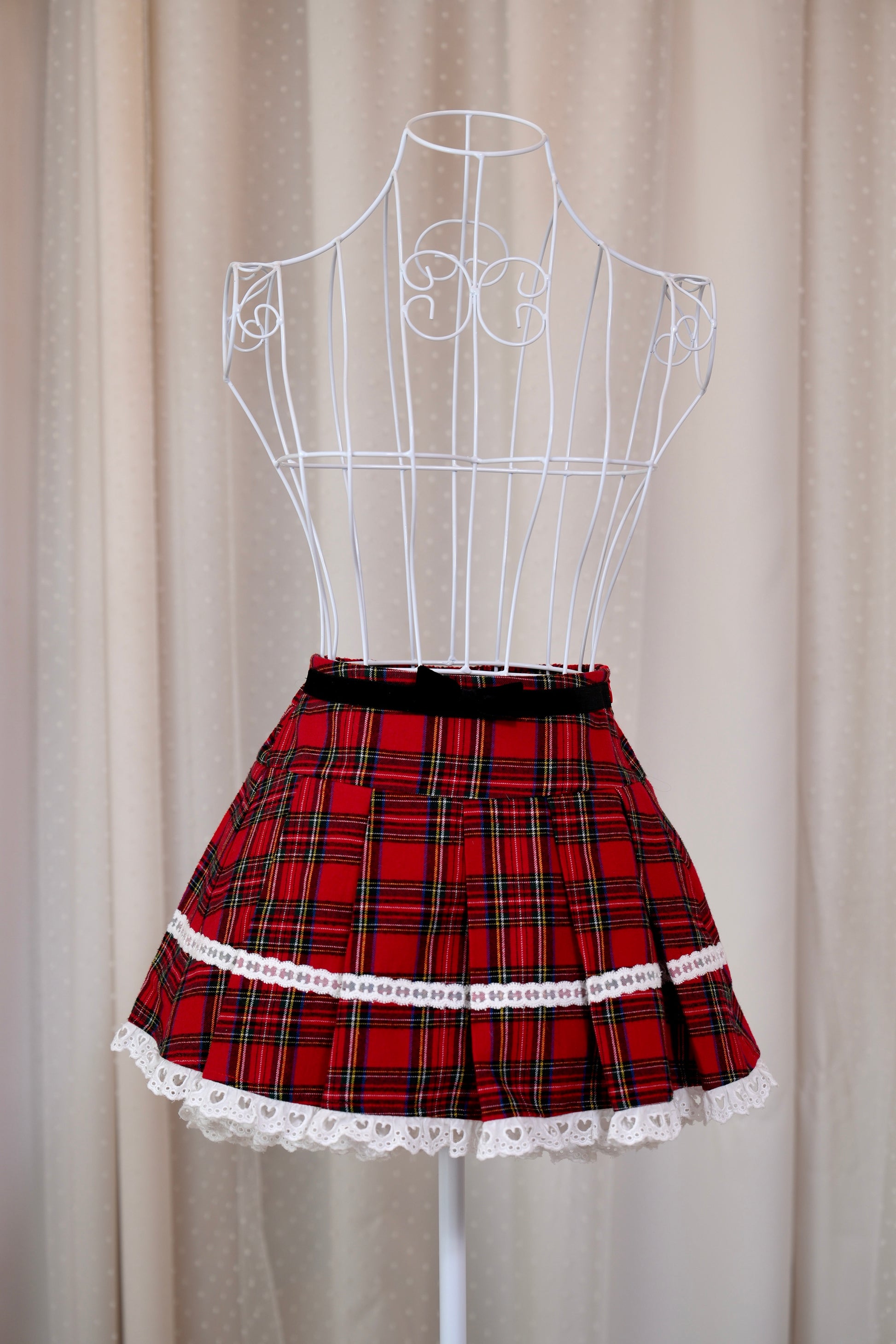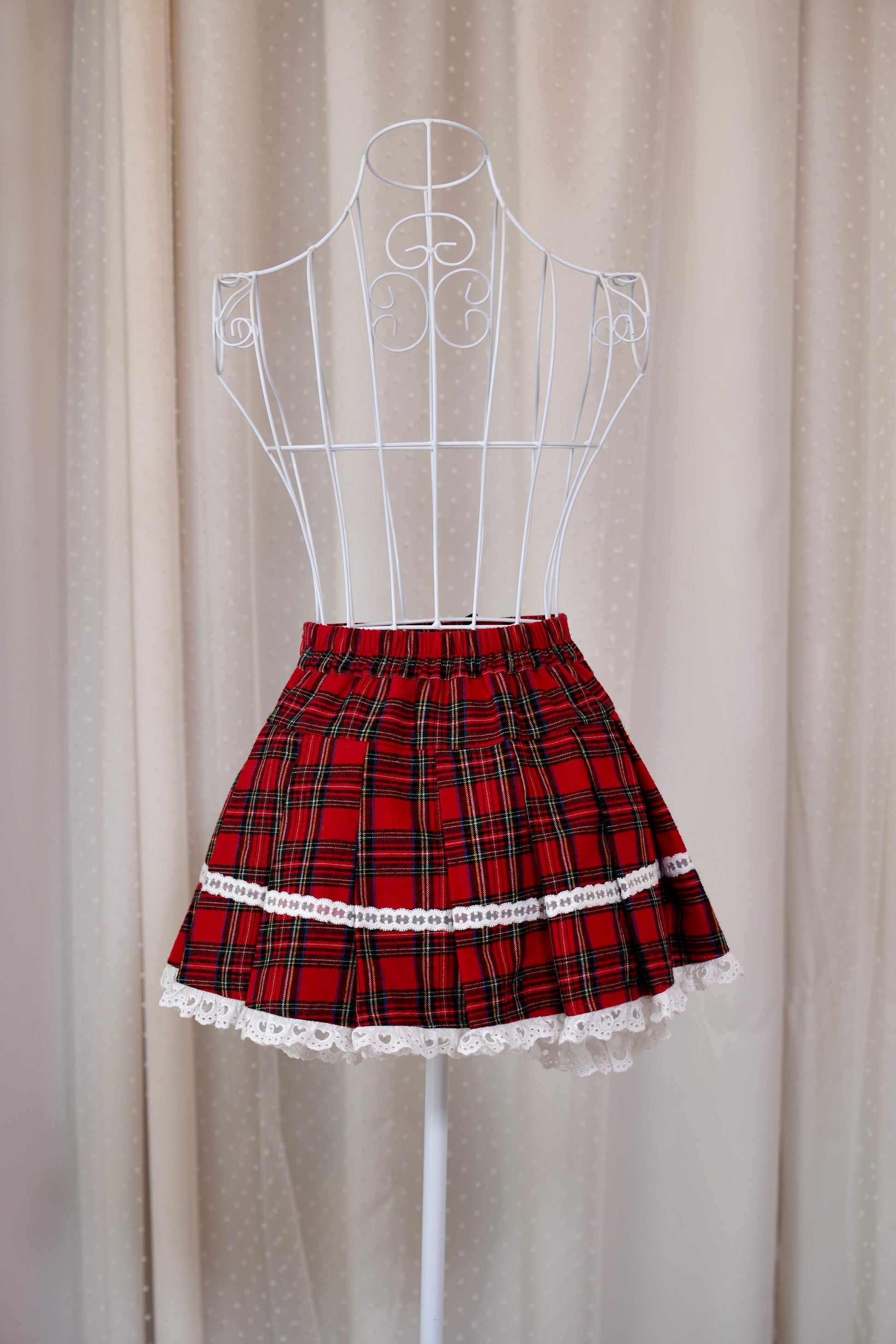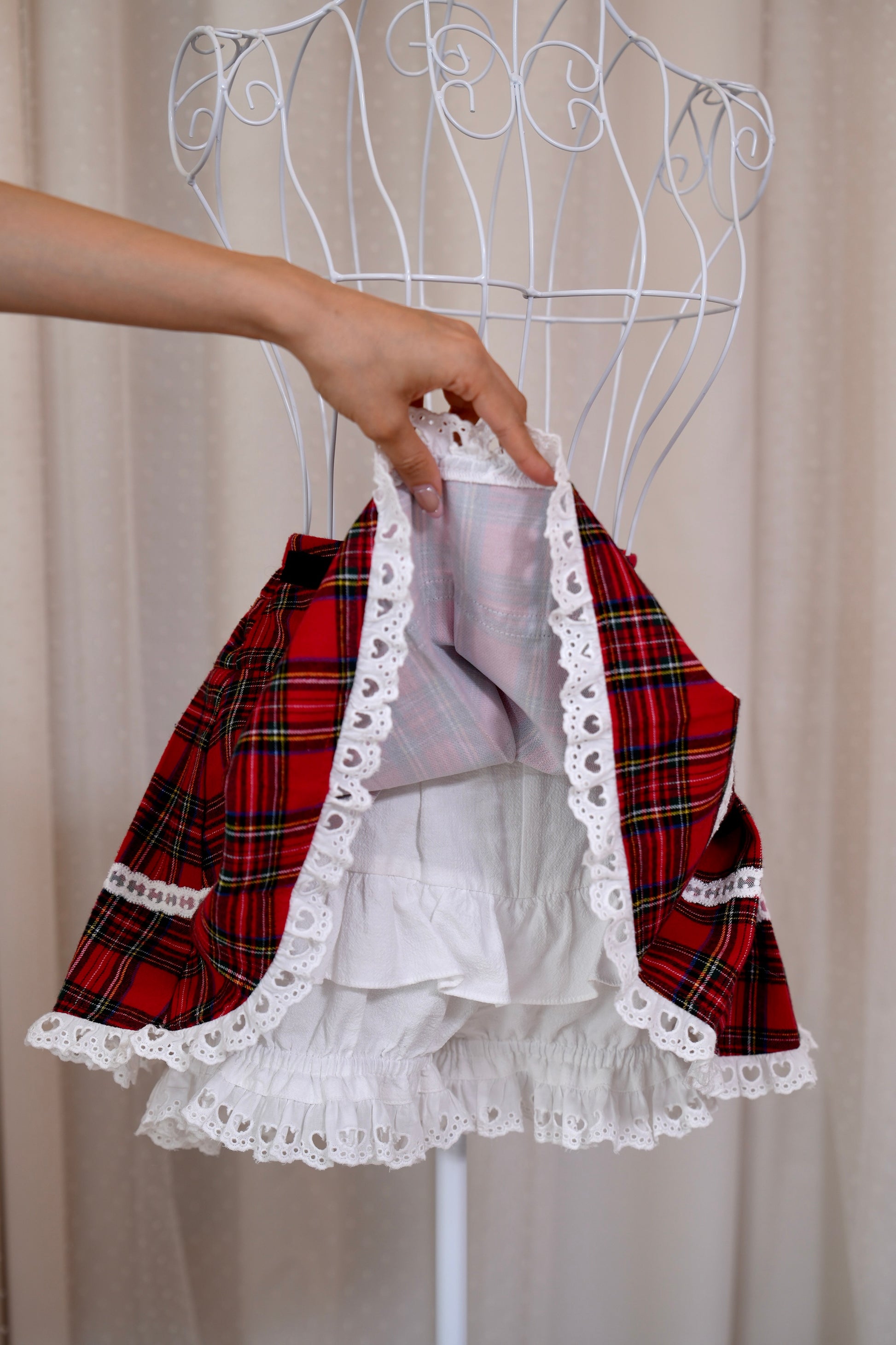 Our Prep School Idol Red Check Skirt is a playful and stylish addition to your wardrobe. This short skirt, crafted from thick cotton red check fabric, is adorned with heart-shaped lace for a touch of sweetness. Perfect for a youthful and energetic look, it comes with built-in bloomers for added comfort and confidence.