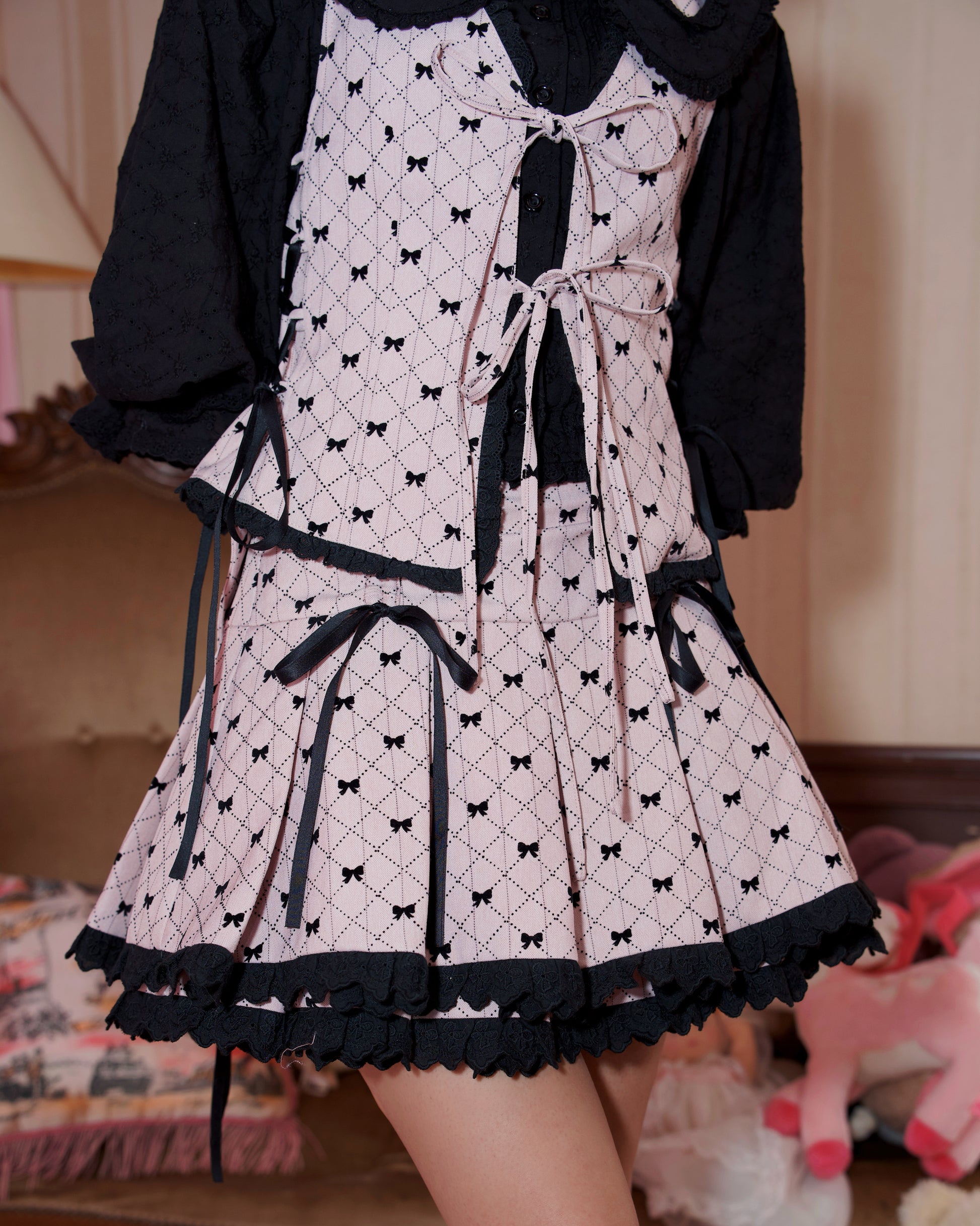 This sweet vest pairs perfectly with the Ribboned Charm Skirt. It features delicate front ribbon ties, lace trim, and side ribbon accents for a flattering shape. Lightweight and detailed, it layers beautifully over blouses.