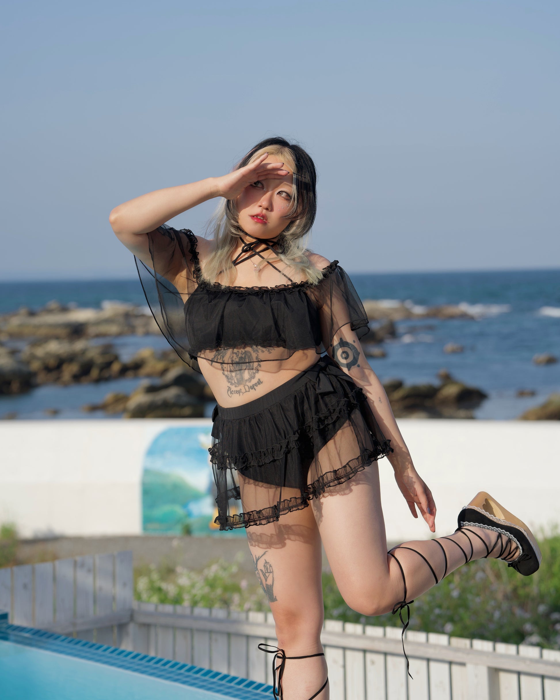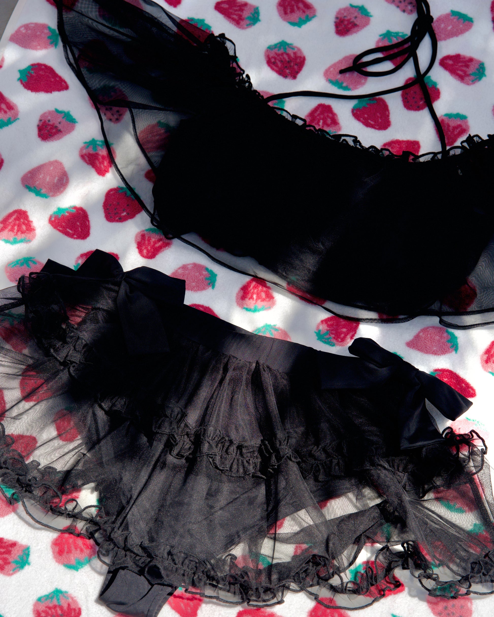 A two-piece swimsuit made for daydreamers - featuring a soft tulle layer over a bikini and delicate ties around the neck that can be worn however you like! Available in sweet floral pink or timeless black, it's perfect for twirling by the water and soaking up the sun.