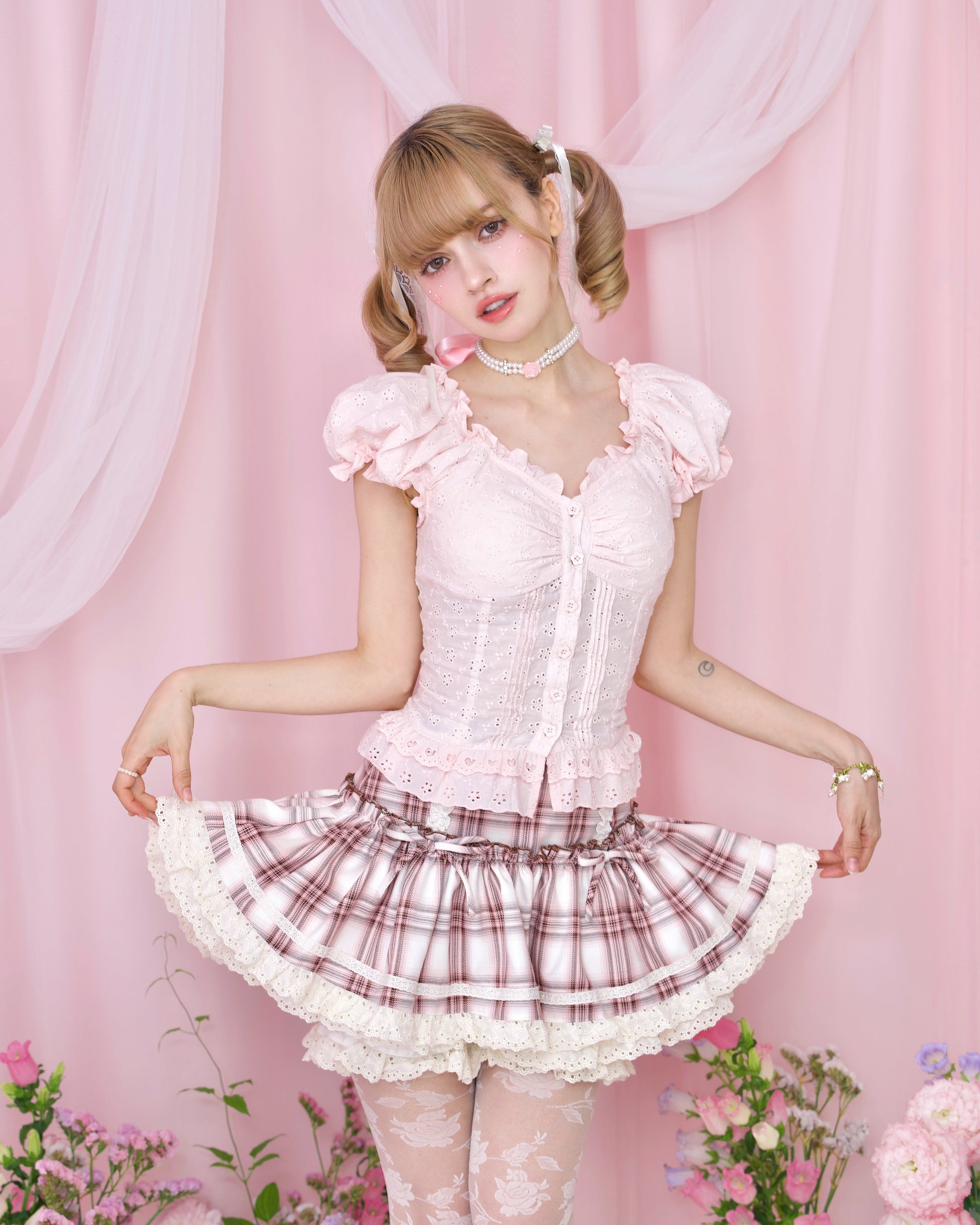 This dreamy blouse is made from pink cotton fabric with frilly lace details and a romantic corset-style lace-up back. The soft, versatile neckline can be worn on or off the shoulders, giving you that perfect shojo anime look, with removable cups for a versatile fit. Sweet, delicate, and full of charm - just like your favourite heroine.