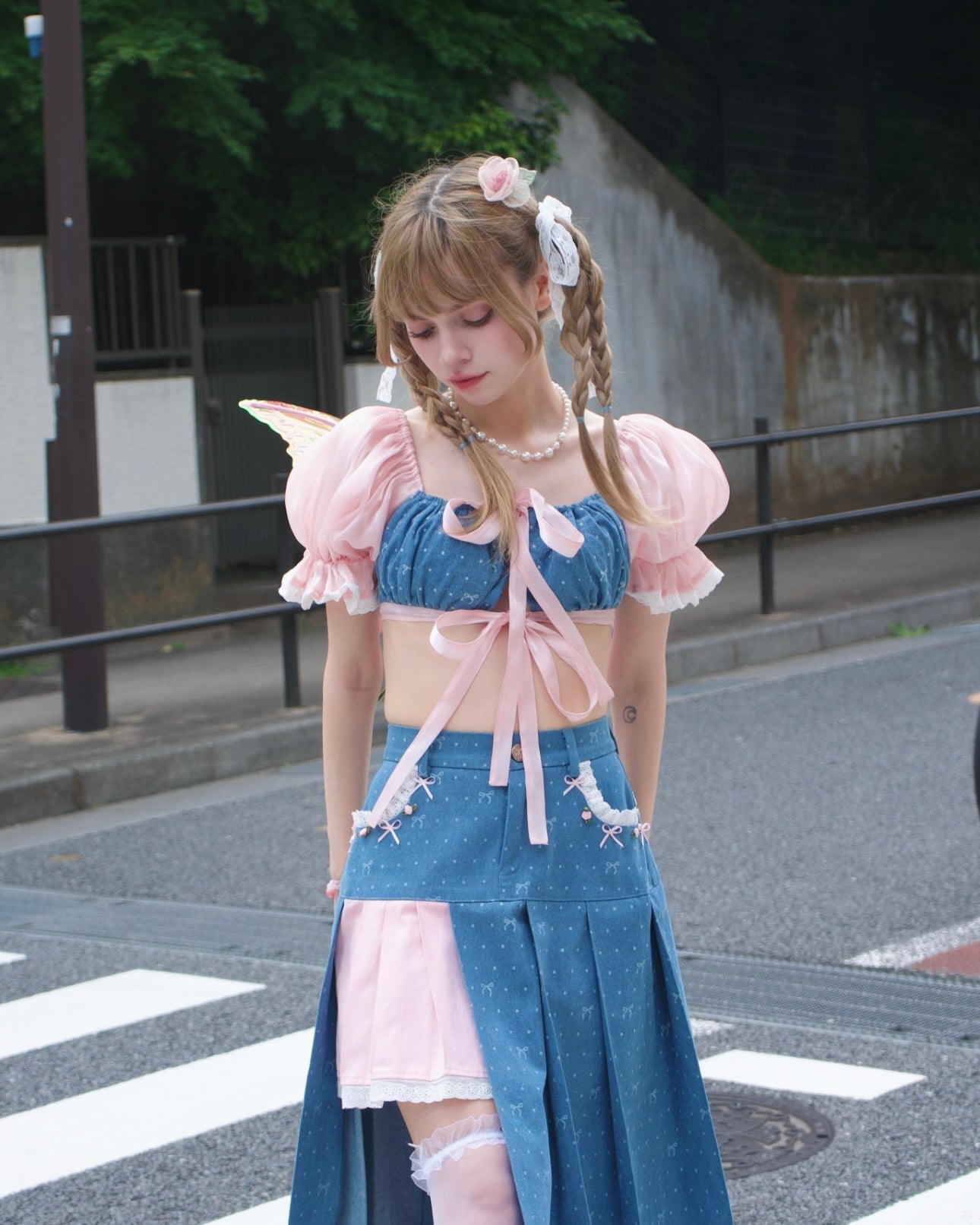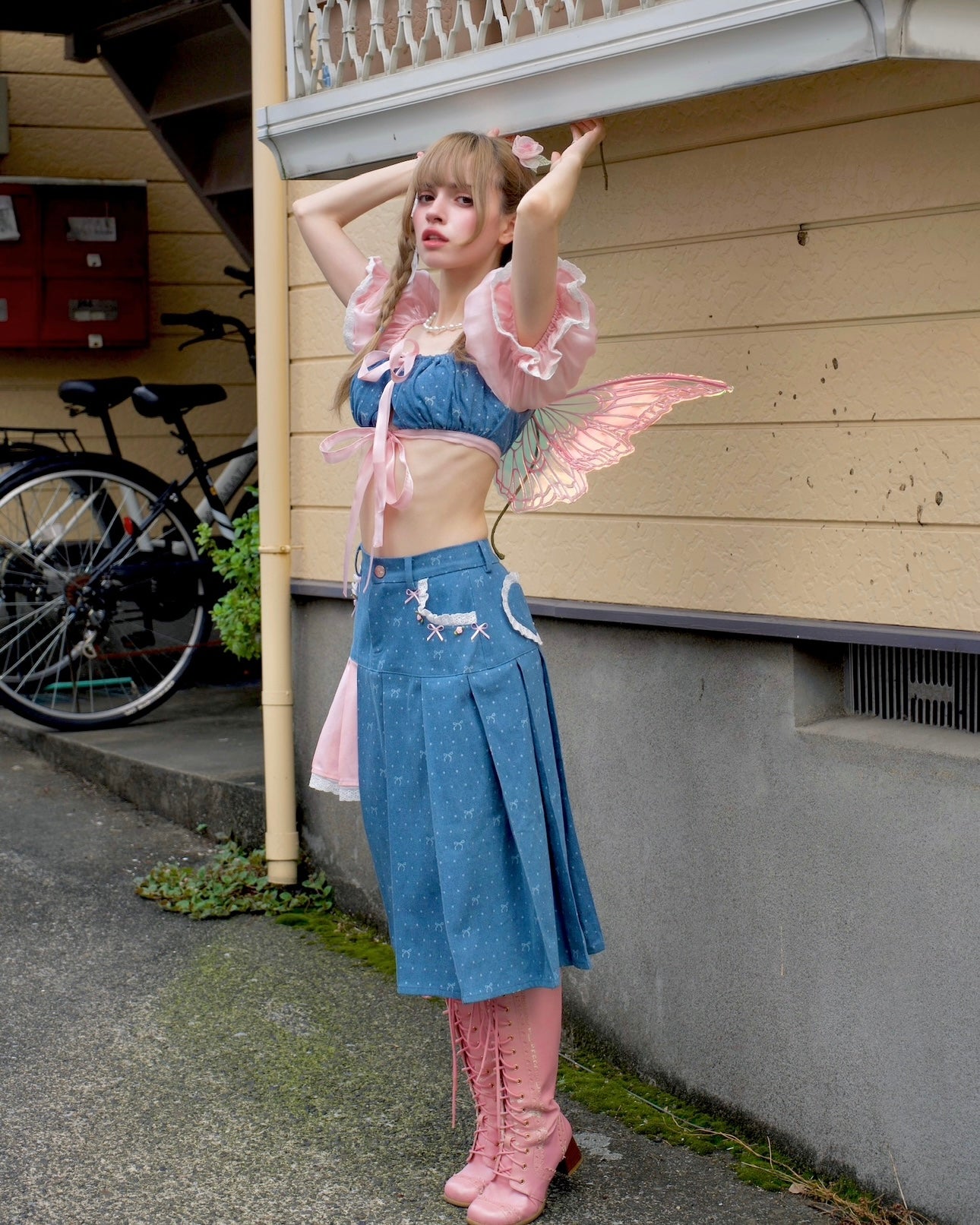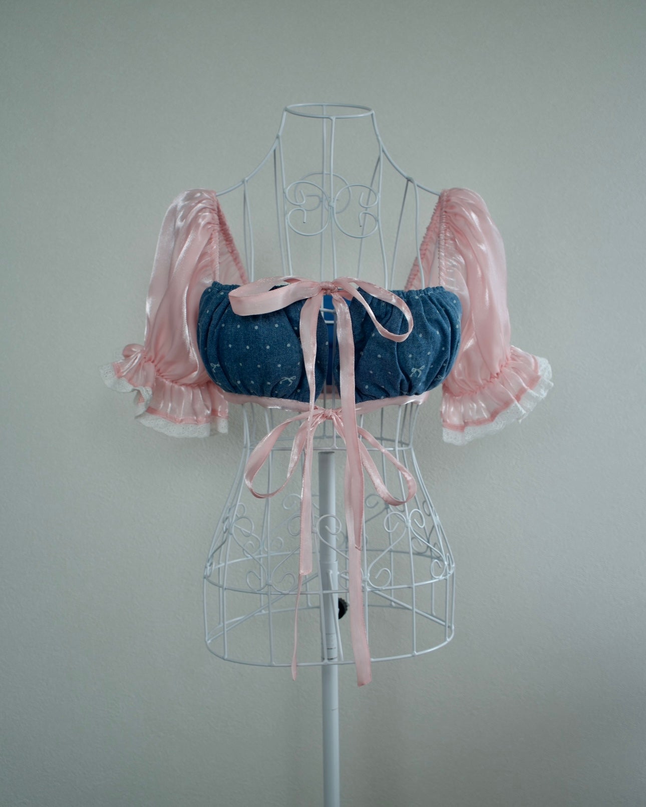 This is the top of the denim set, elegantly juxtaposing the sturdy denim fabric with the light and airy organza puff sleeves and straps. The top features removable cups so that it may be worn on its own. The sleeves and top of the bust are elasticated for comfortable wear.