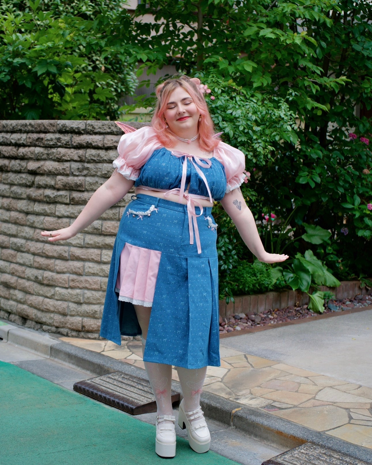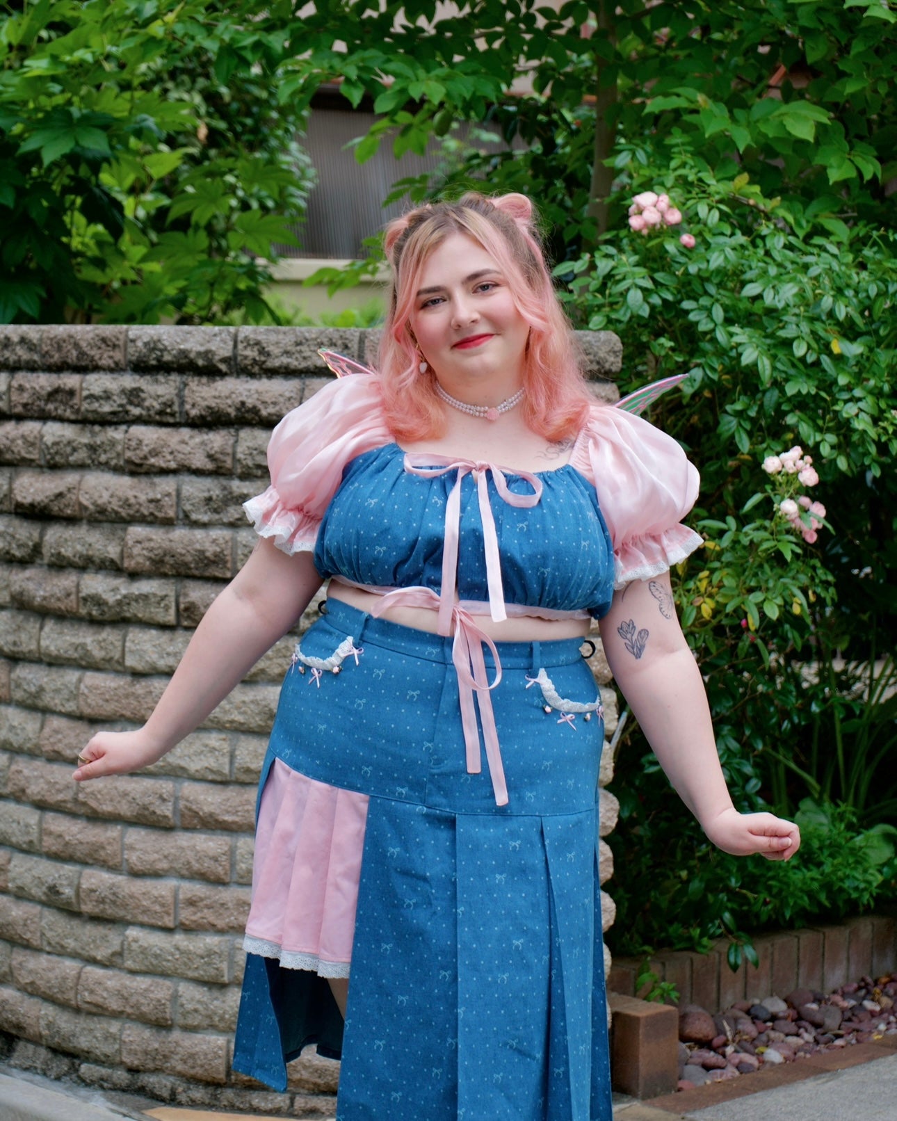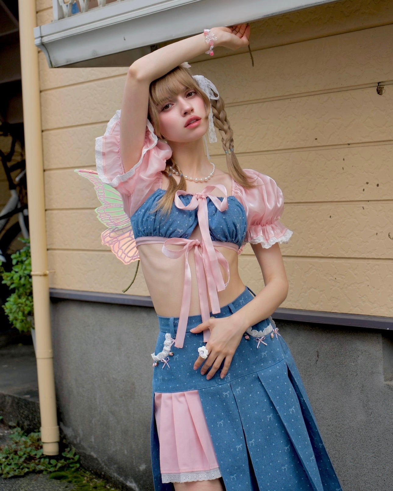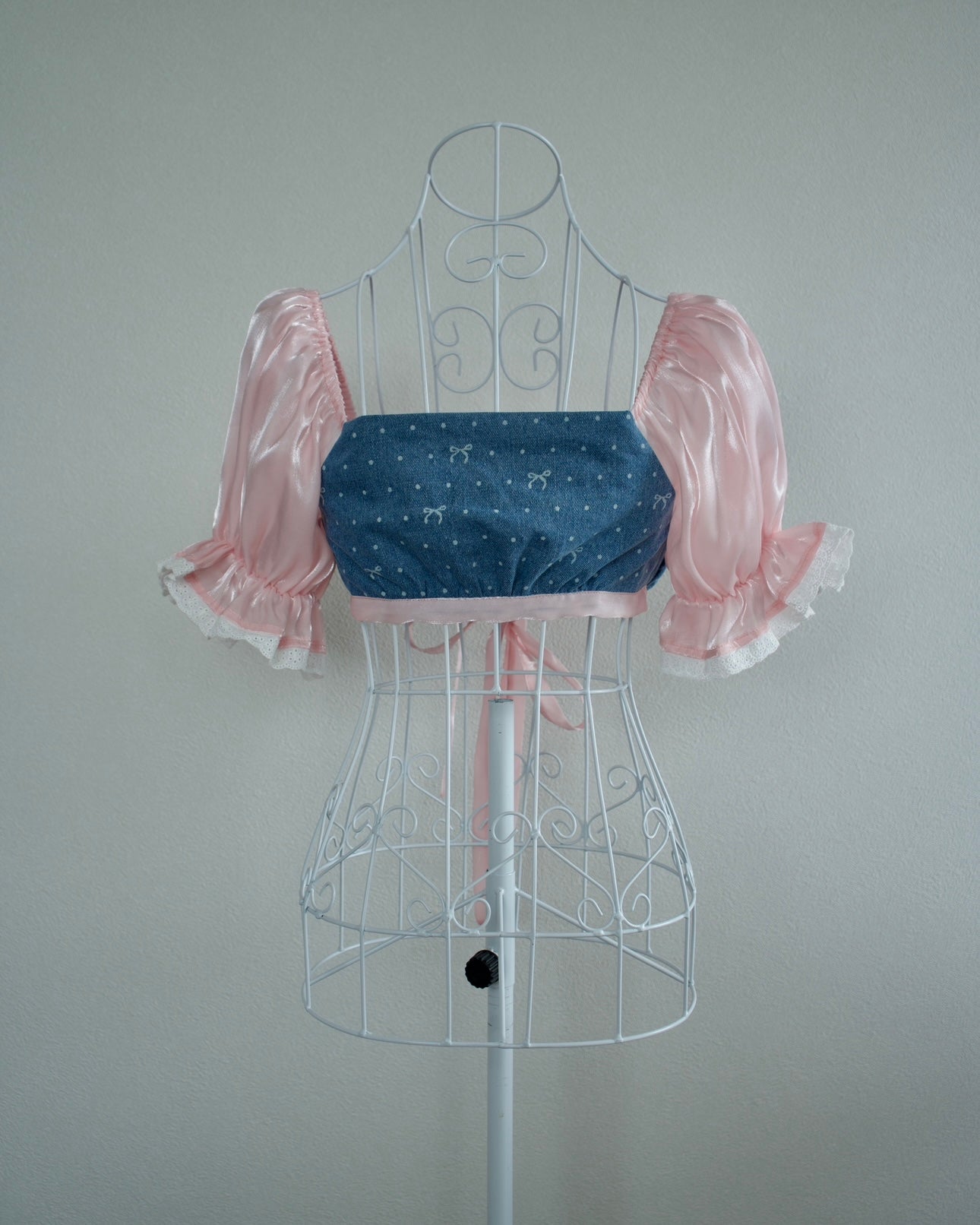 This is the top of the denim set, elegantly juxtaposing the sturdy denim fabric with the light and airy organza puff sleeves and straps. The top features removable cups so that it may be worn on its own. The sleeves and top of the bust are elasticated for comfortable wear.