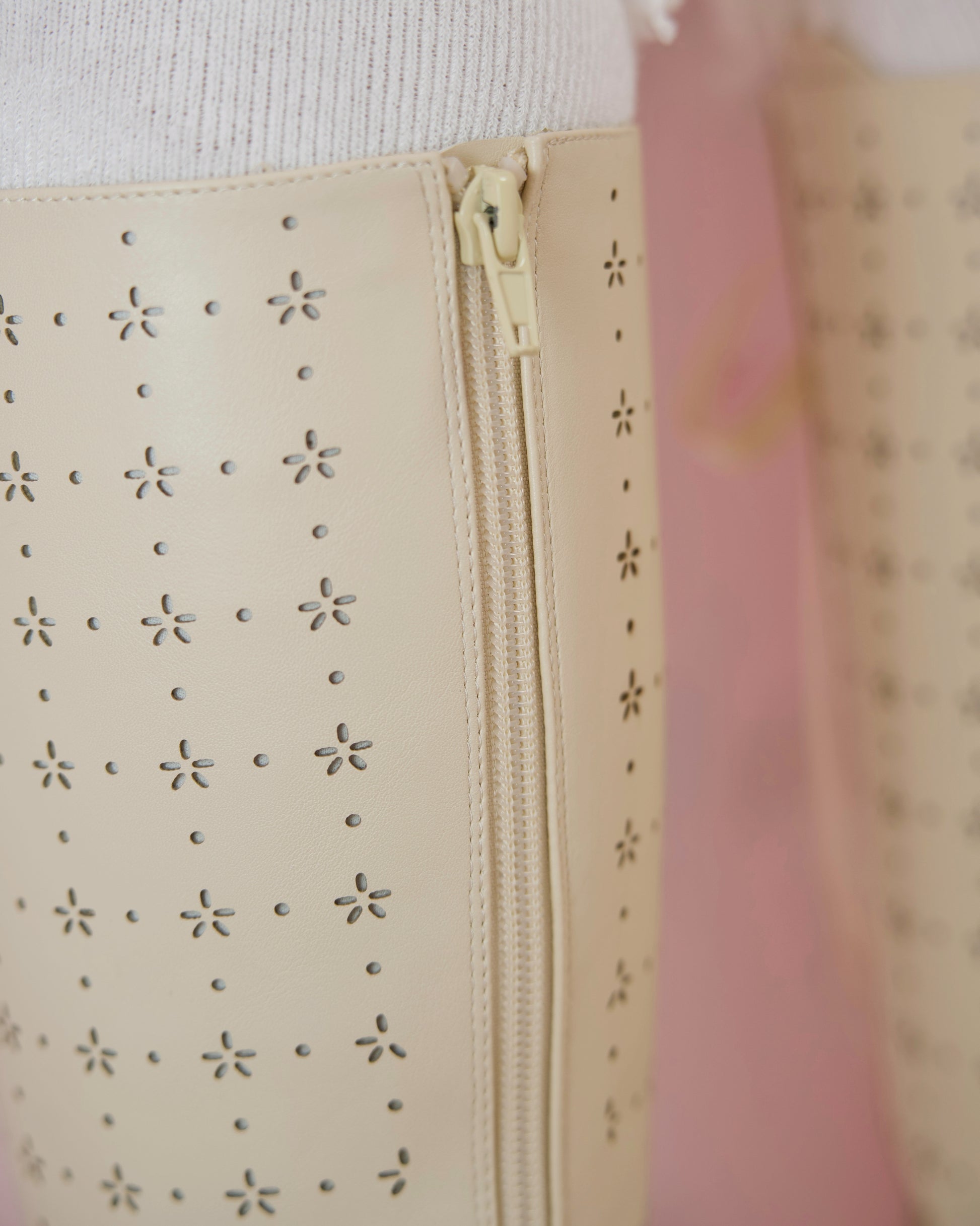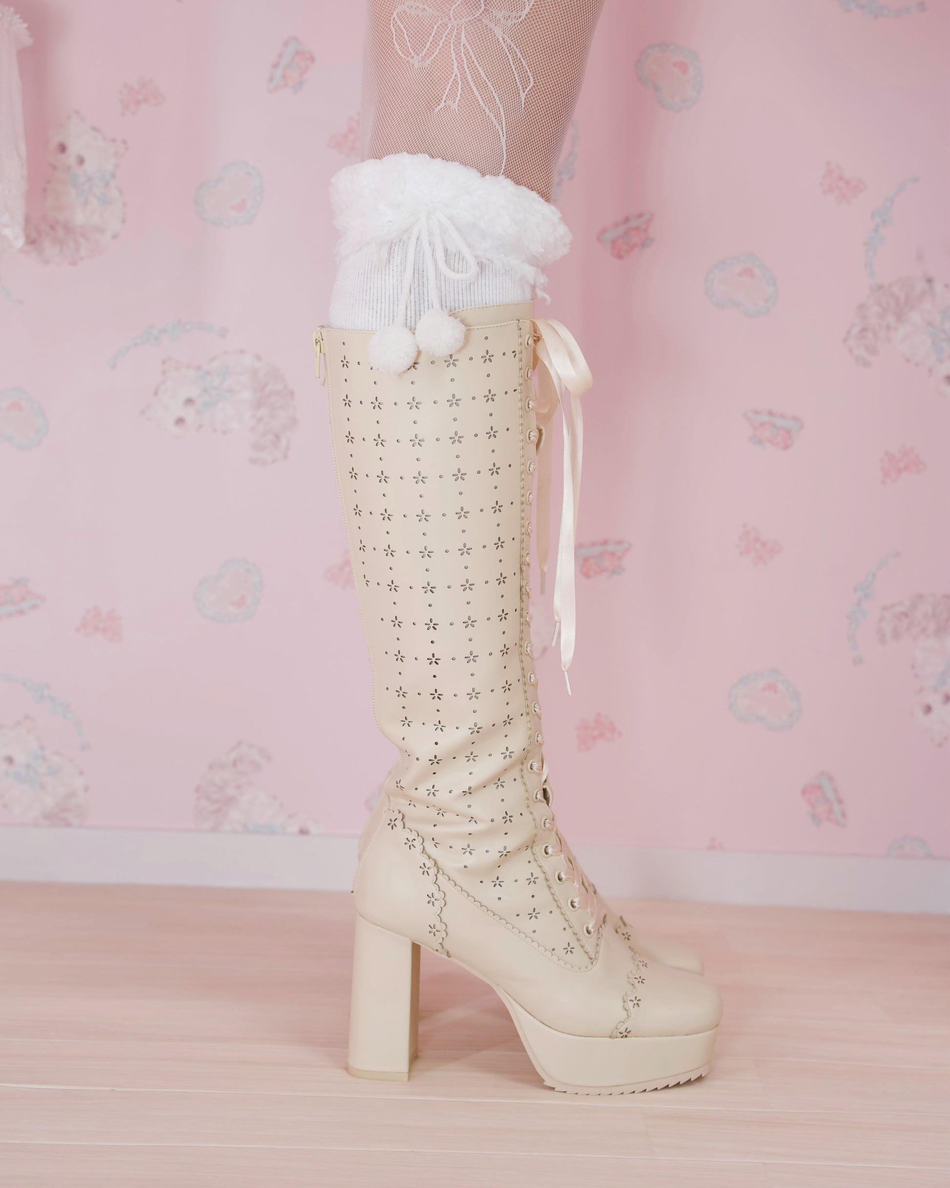 Make a statement with these dreamy lace up knee high boots, designed to bring a soft, romantic touch to any outfit. Their tall silhouette is adorned with delicate cut out florals and finished with long laces that trail beautifully down the leg.