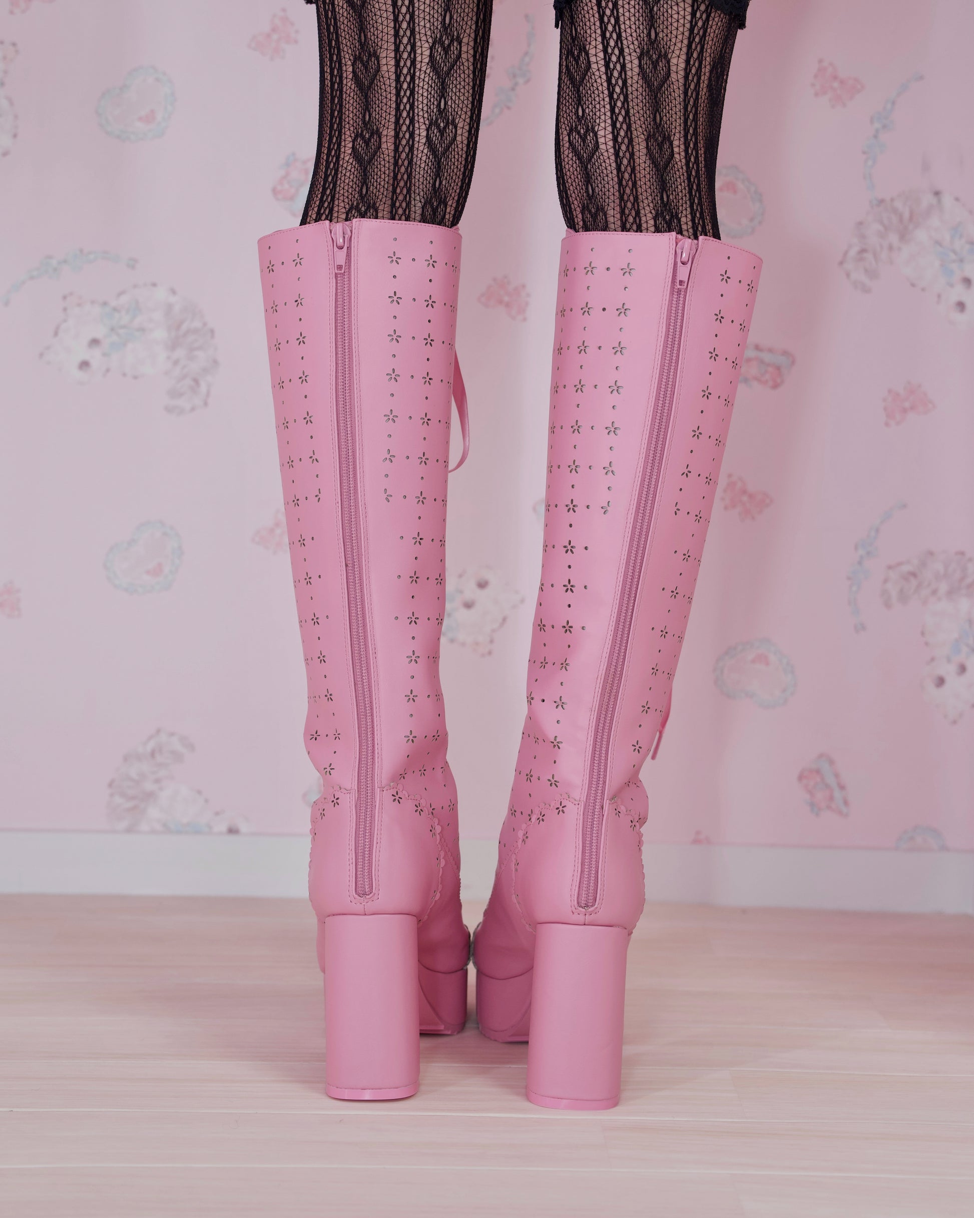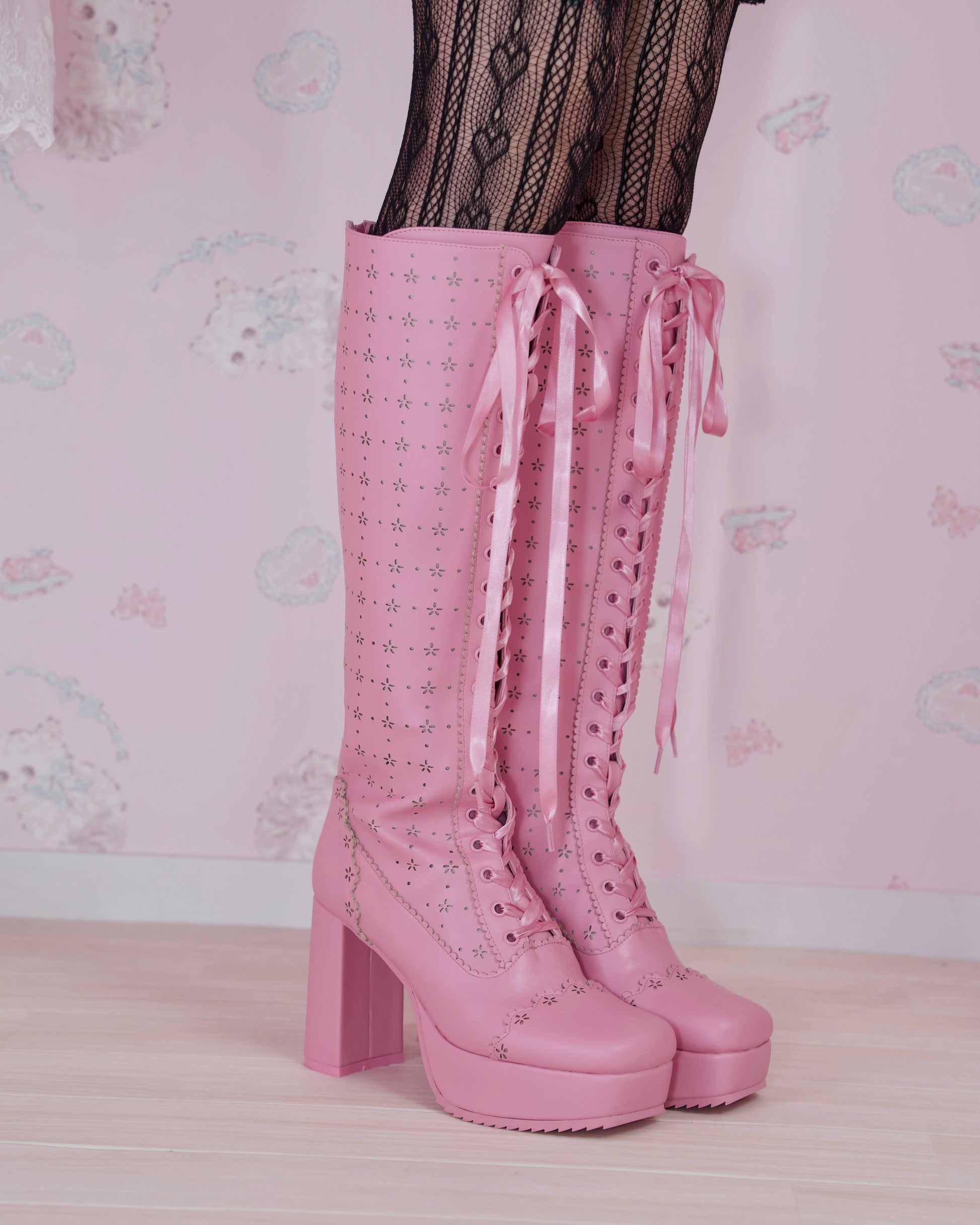 Make a statement with these dreamy lace up knee high boots, designed to bring a soft, romantic touch to any outfit. Their tall silhouette is adorned with delicate cut out florals and finished with long laces that trail beautifully down the leg.