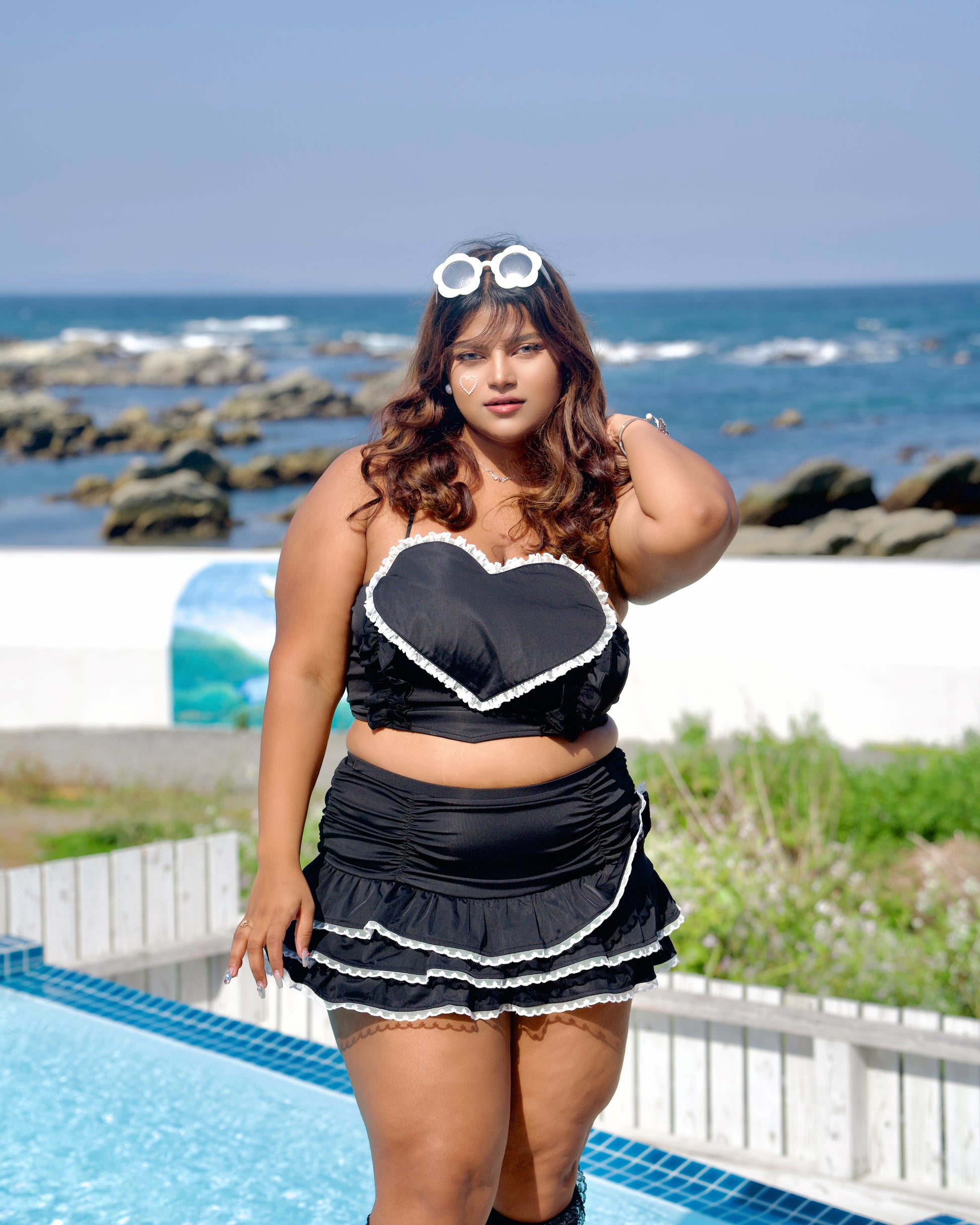 This cute swimsuit set features a heart-shaped cutout with delicate lace around it, giving it a sweet, feminine touch. The bottom has a frilly skirt with built-in swim pants, offering the perfect mix of fun and comfort. Whether you're lounging by the pool or splashing around at the beach, this set will have you feeling cute and carefree. The top has removable cups.