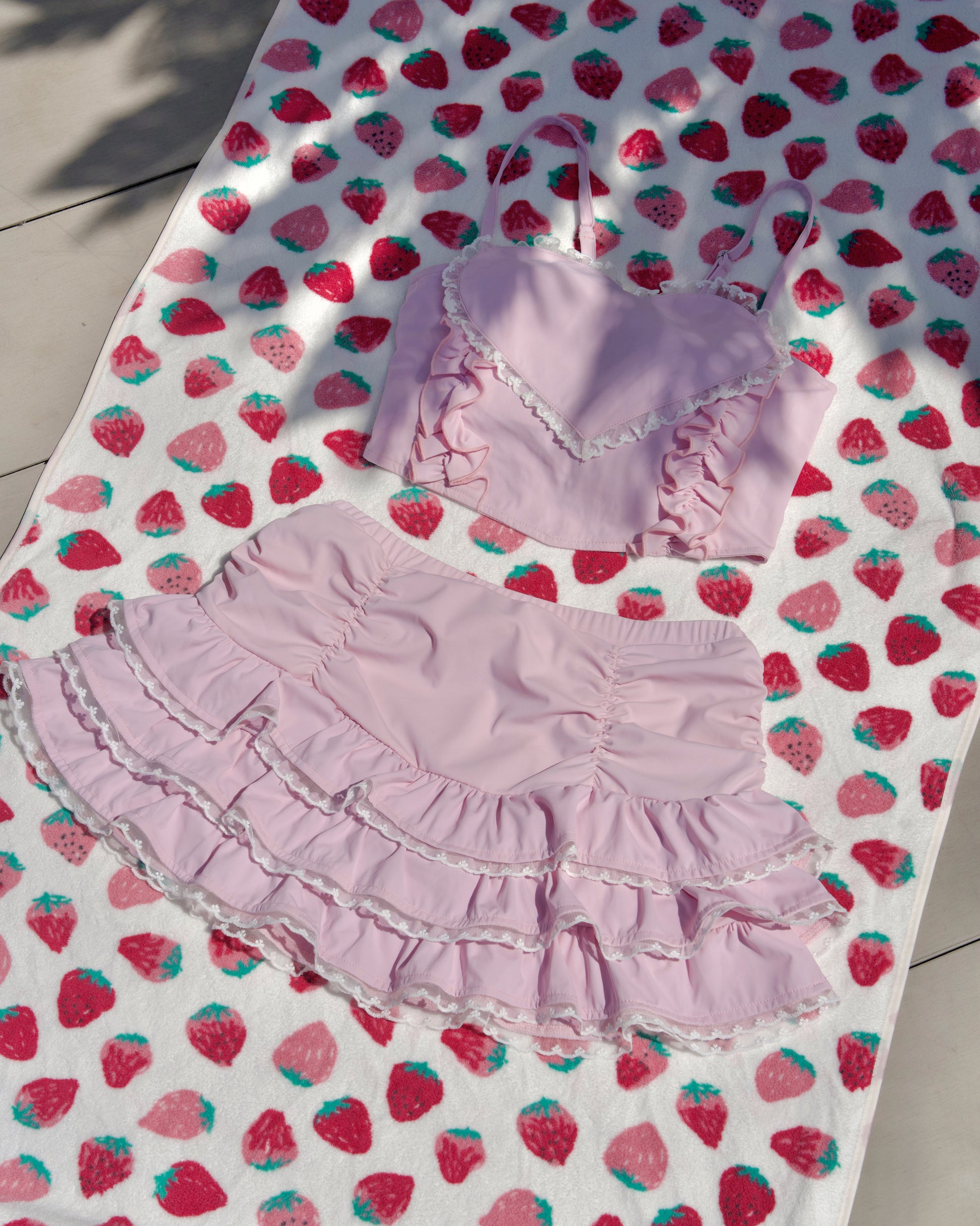 This cute swimsuit set features a heart-shaped cutout with delicate lace around it, giving it a sweet, feminine touch. The bottom has a frilly skirt with built-in swim pants, offering the perfect mix of fun and comfort. Whether you're lounging by the pool or splashing around at the beach, this set will have you feeling cute and carefree.