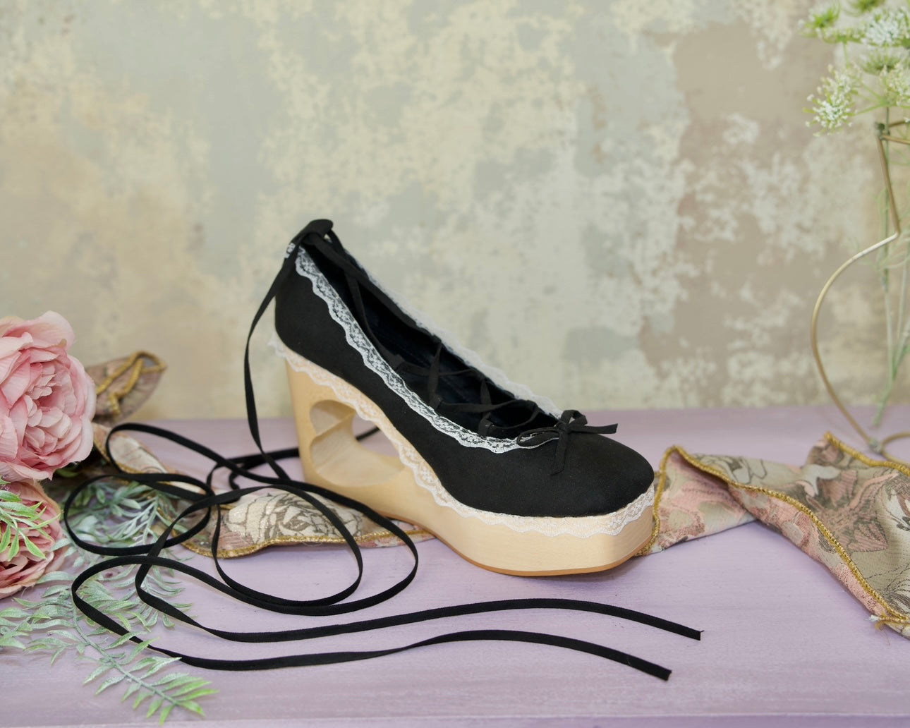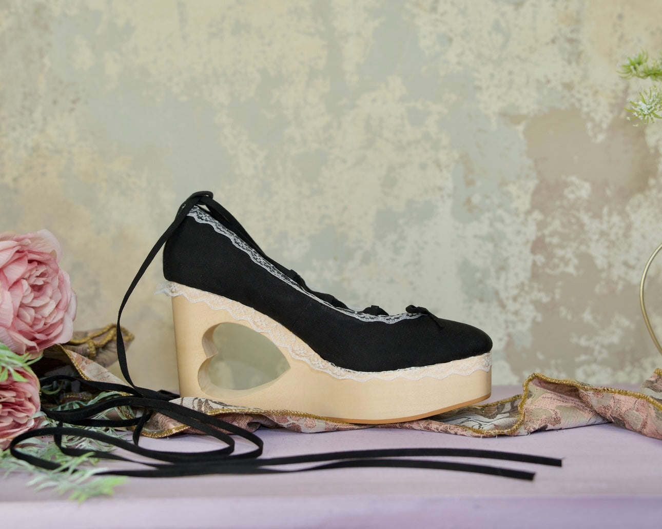 Ballerina inspired wooden platform heels with a heart cut out - is there a more romantic shoe than this? Adorned with an accent ribbon and lace, this is a lover girl's dream heel.