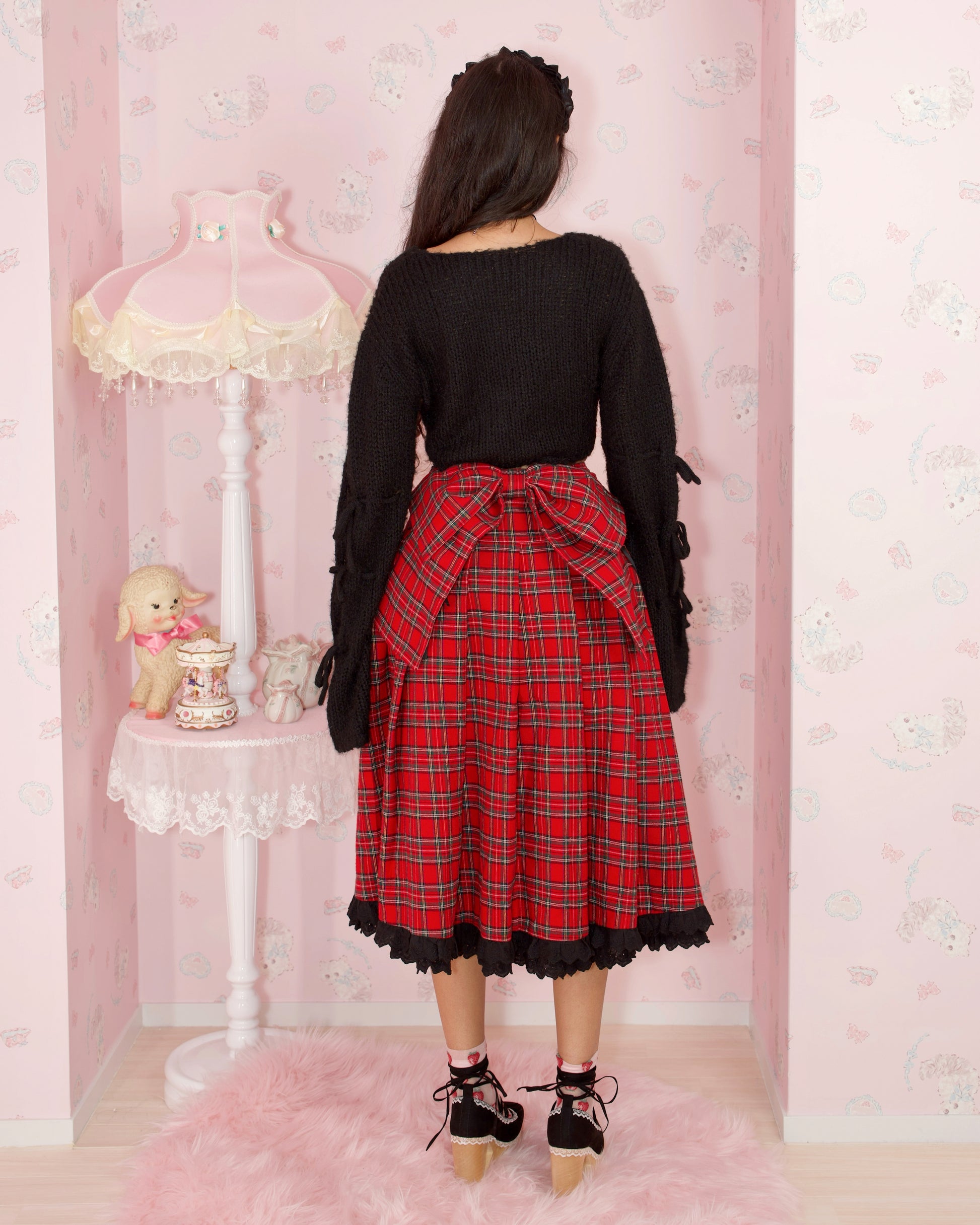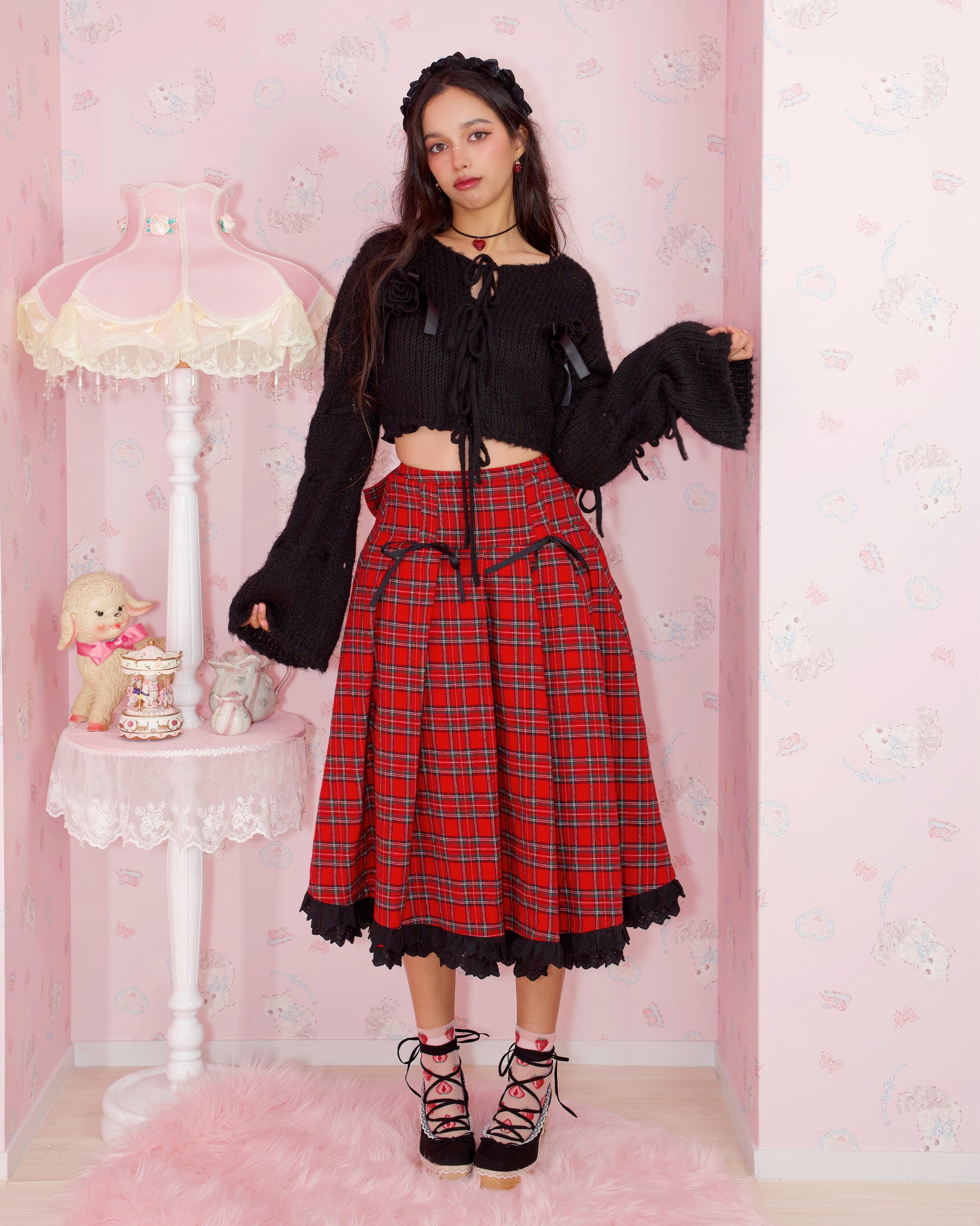 This sweet long skirt brings a cosy, romantic touch to your wardrobe with its classic check pattern and delicate ribbon details. It features charming front ribbon ties, a softly flared silhouette, and a lace hem for a gentle, feminine finish.