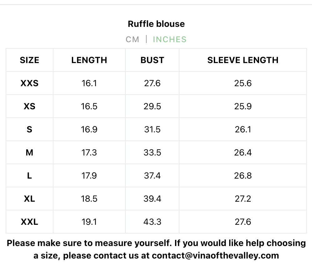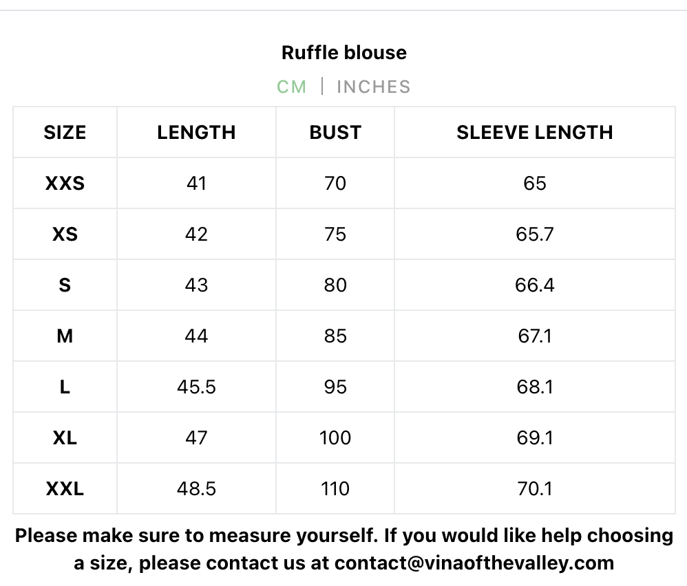 サイズは予想と異なる場合がありますので、サイズチャートとご自身の計測結果を比較してください。ご質問があれば、contact@vinaofthevalley.com までお気軽にお問い合わせください。