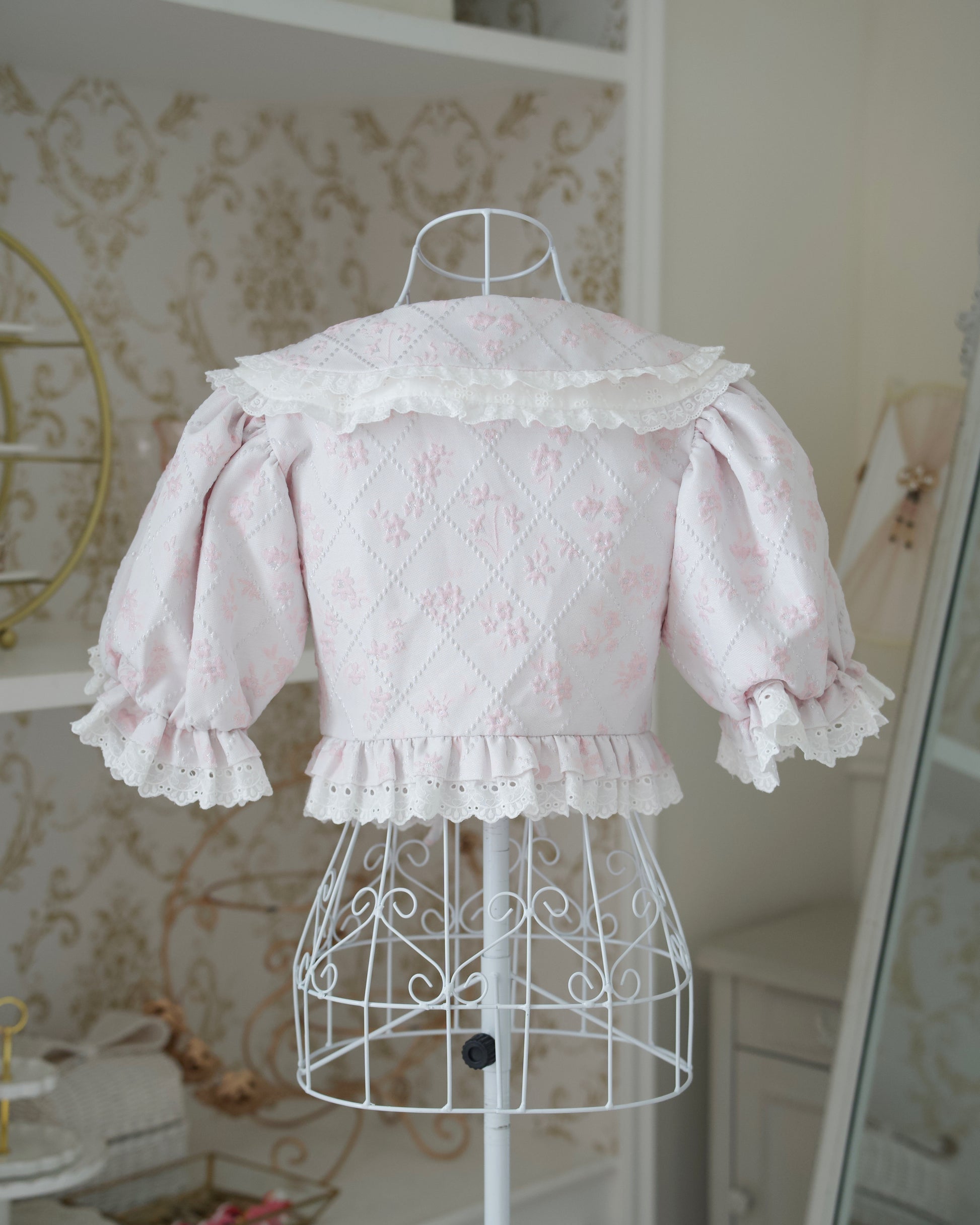 A comfortable cotton lined set, with dainty and light pink floral detailed jacquard fabric. Airy and shimmery for a sunny spring day!