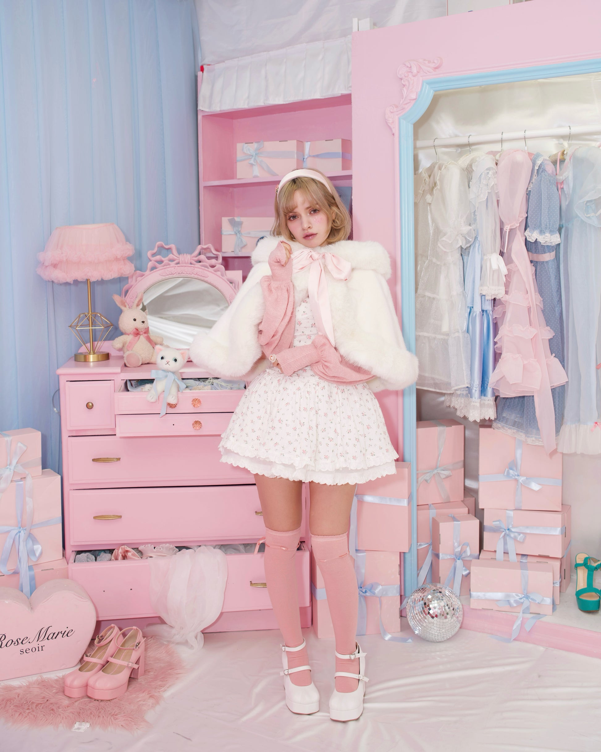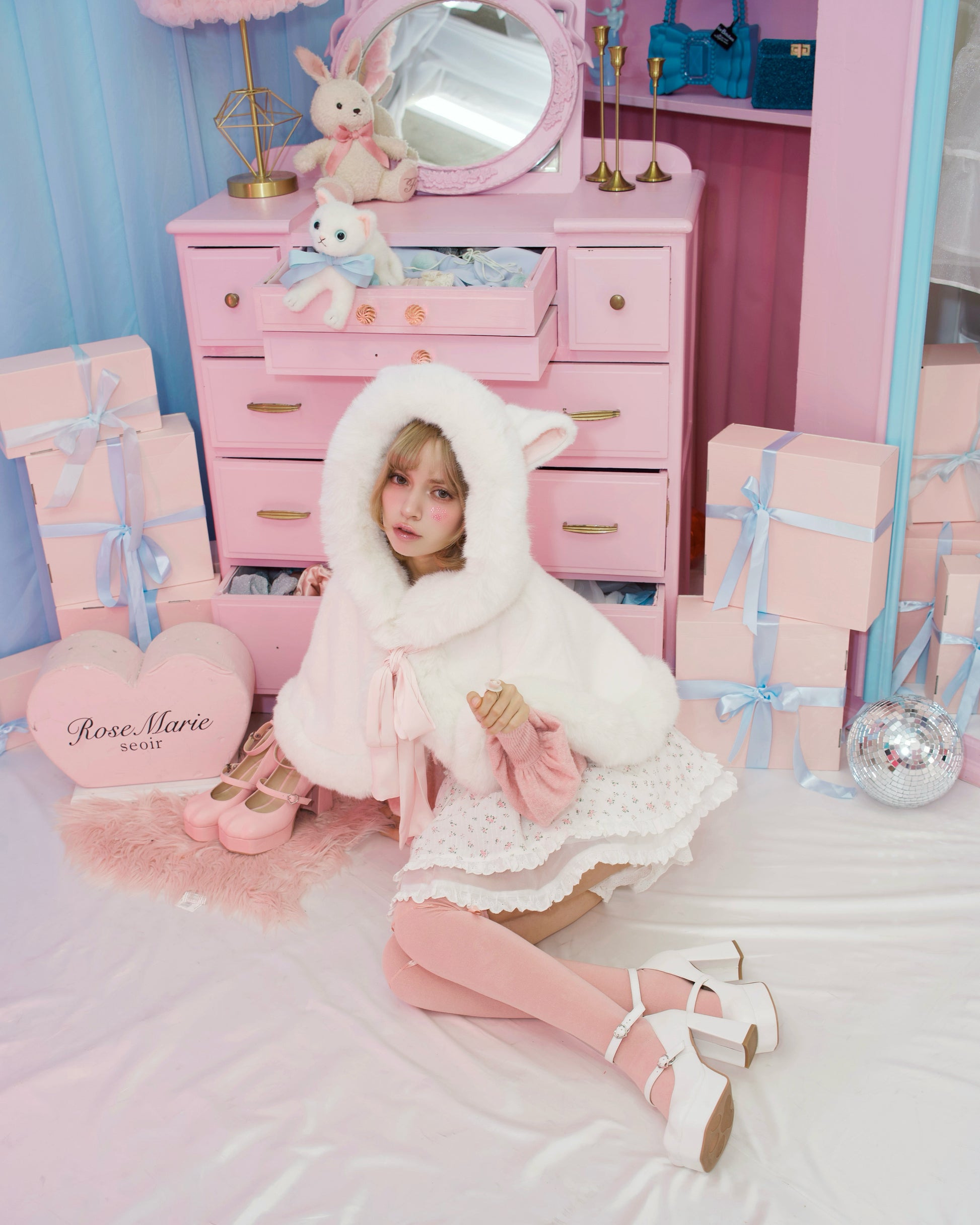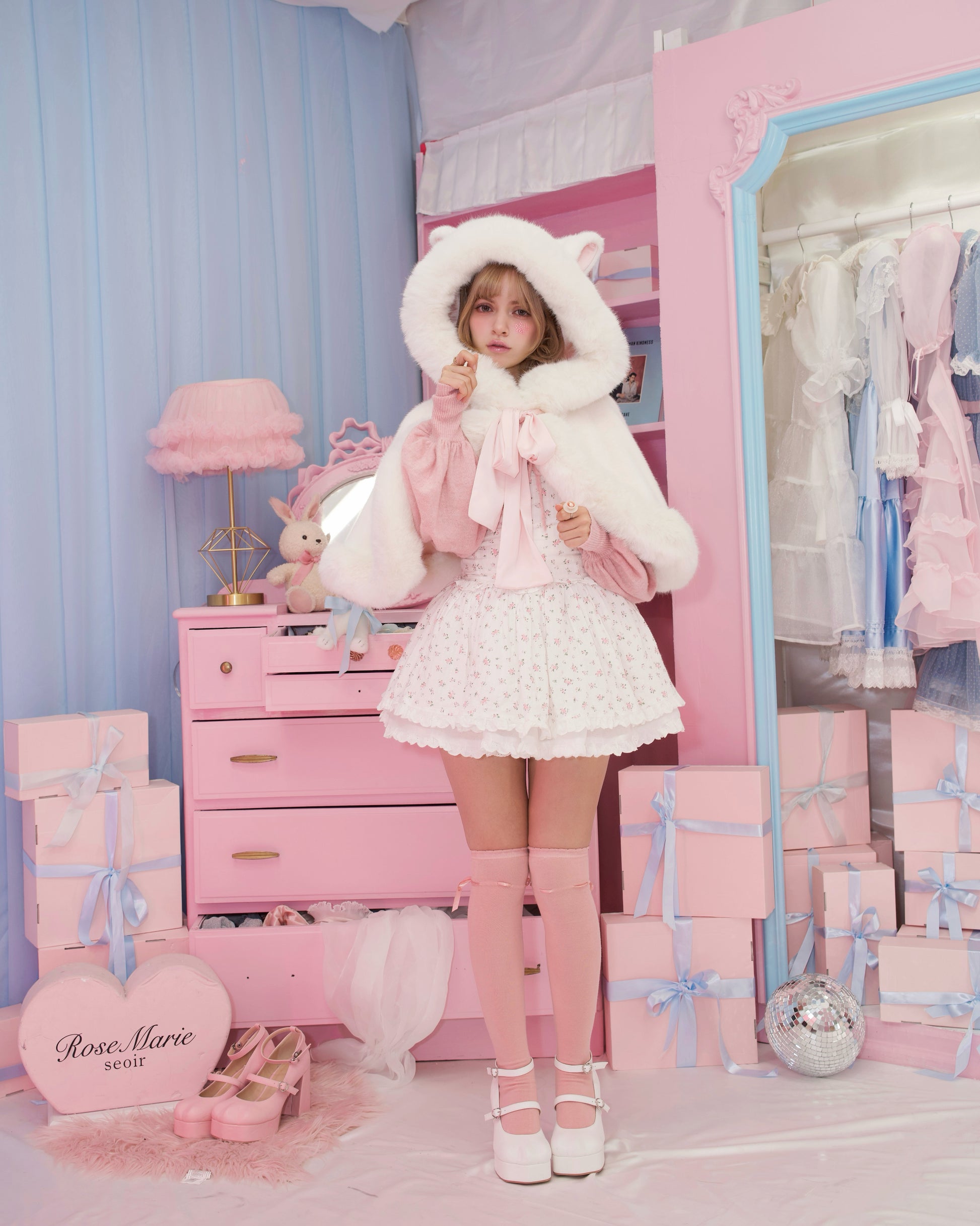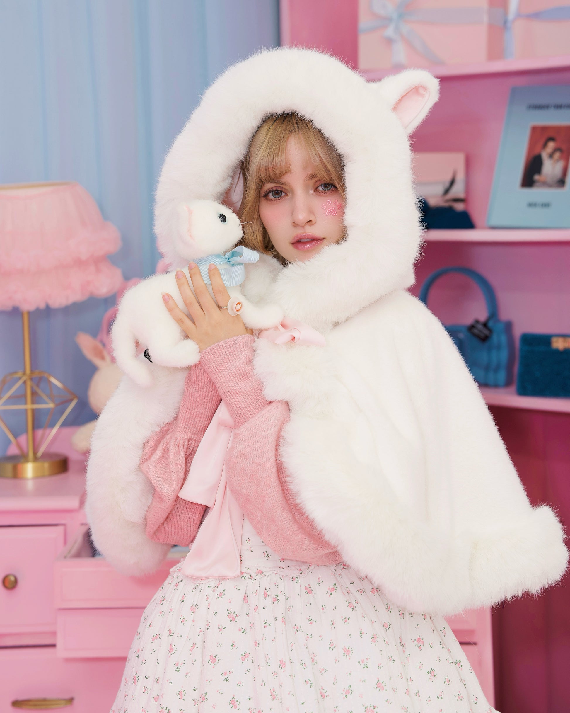 A whimsical yet cosy winter accessory, this faux fur cape is the perfect finishing touch to any outfit. The short cape features a big soft hood with playful ears, a wide pink ribbon tie at the front, and a hidden hook closure for extra security. The ears contain wire that allow them to keep their shape, but they can also be adjusted slightly to your preference.