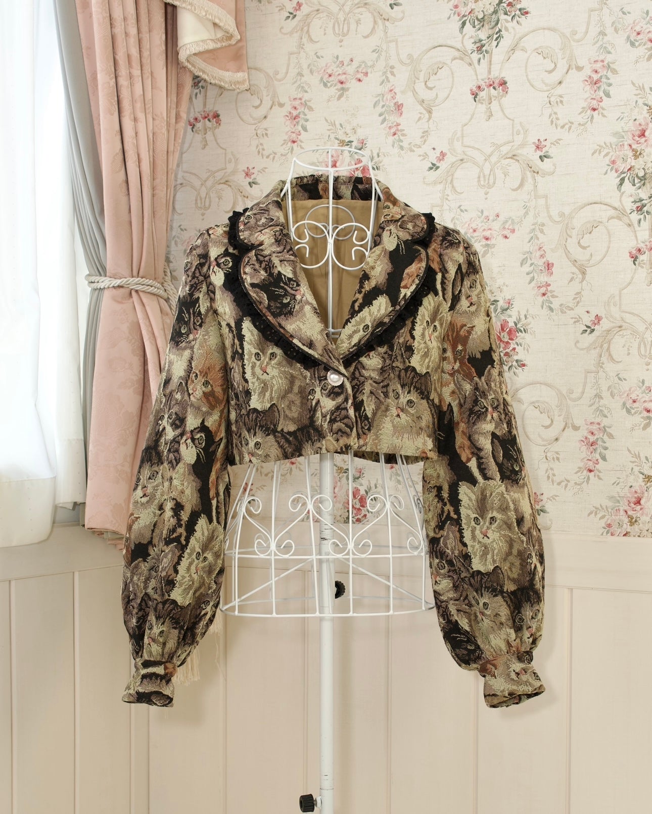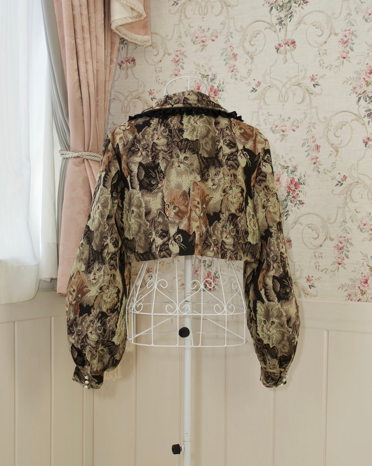 Feel like an idol in this adorable cropped kitty print jacket. Featuring puffed sleeves that cuff perfectly at your wrist, with snap buttons for easy wear, and a sparkly button showcased in the centre. The jacket is made of a thick cat printed fabric.