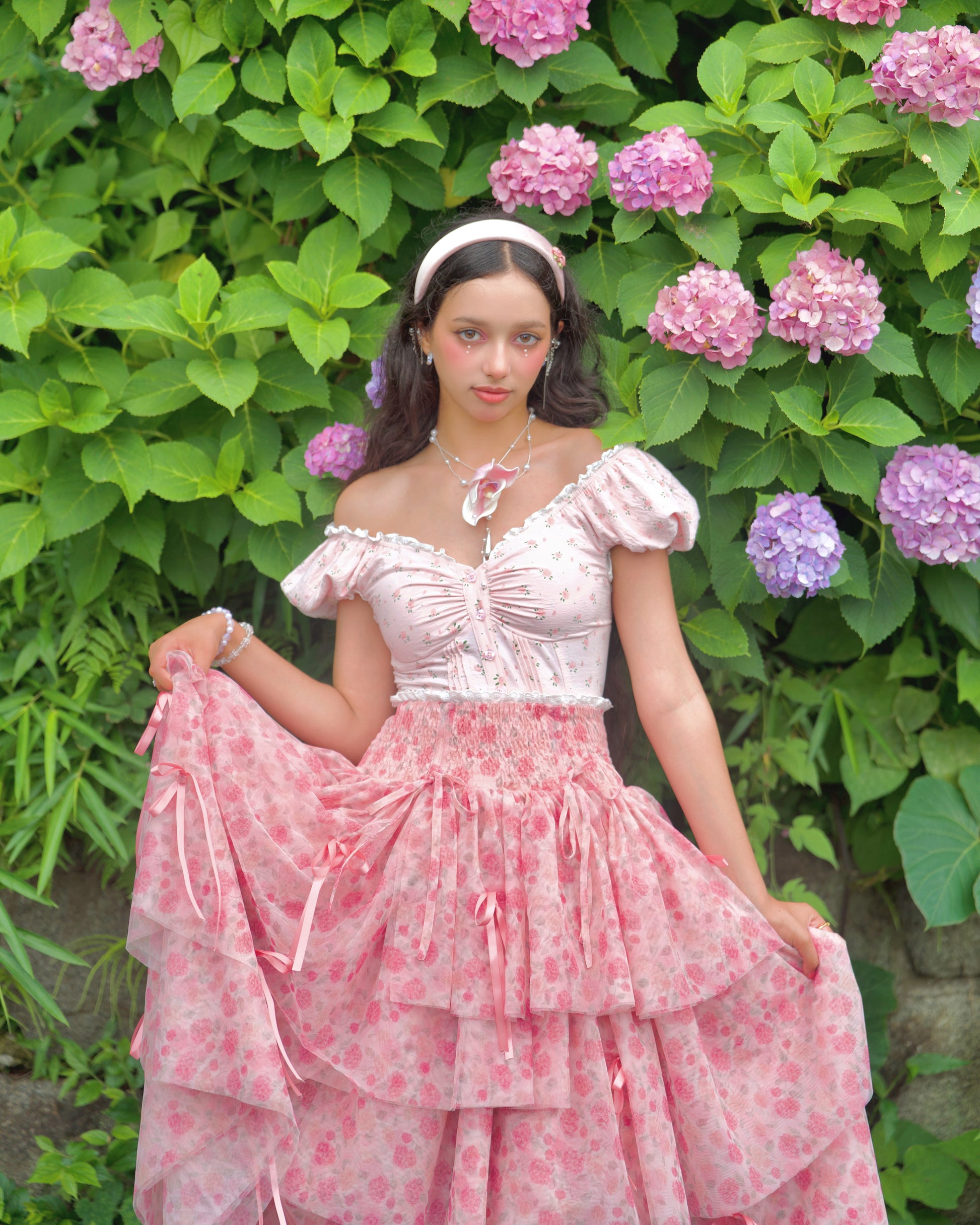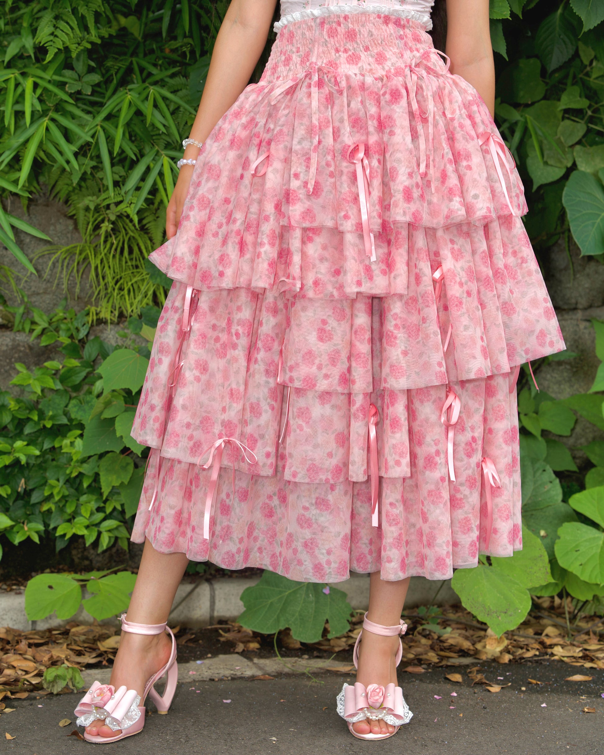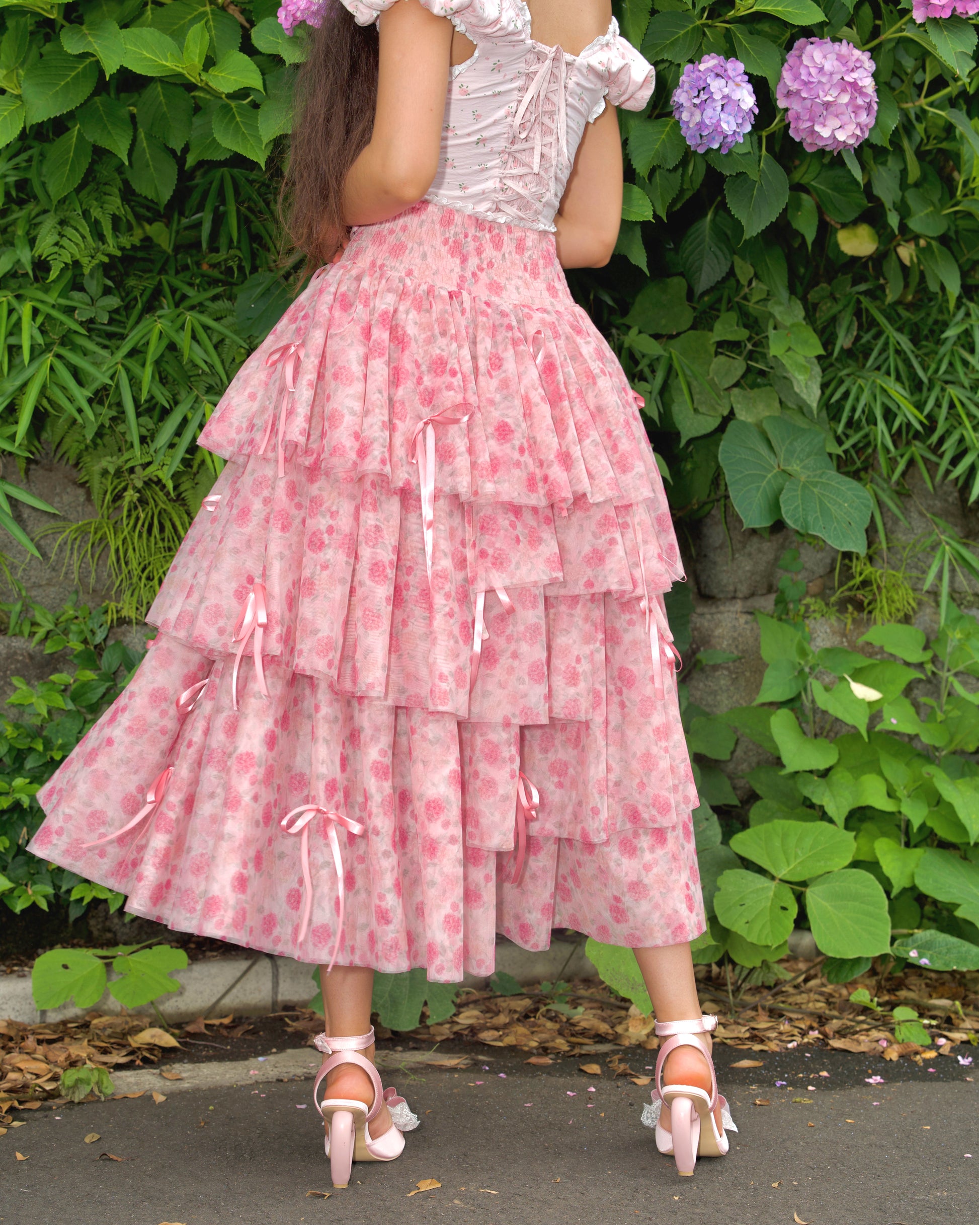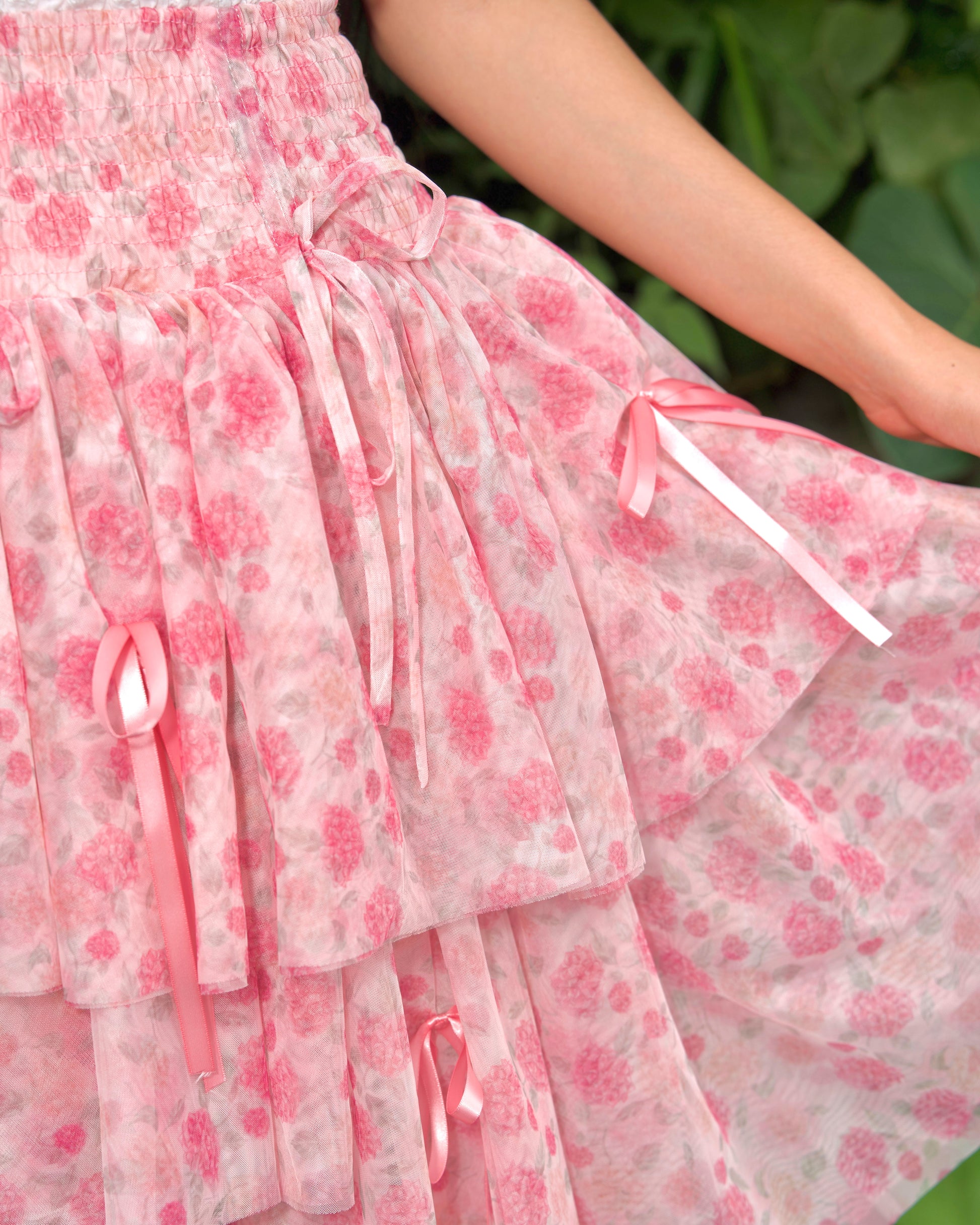 Float through the day in this hydrangea-printed tulle skirt, made with layers upon layers of airy fabric arranged in soft asymmetry. Long trailing ribbons move with you like petals in the breeze, and the waistline is finished with delicate lace trim for a sweet touch. The shirred waistband includes adjustable ties for the length - effortless and full of charm.