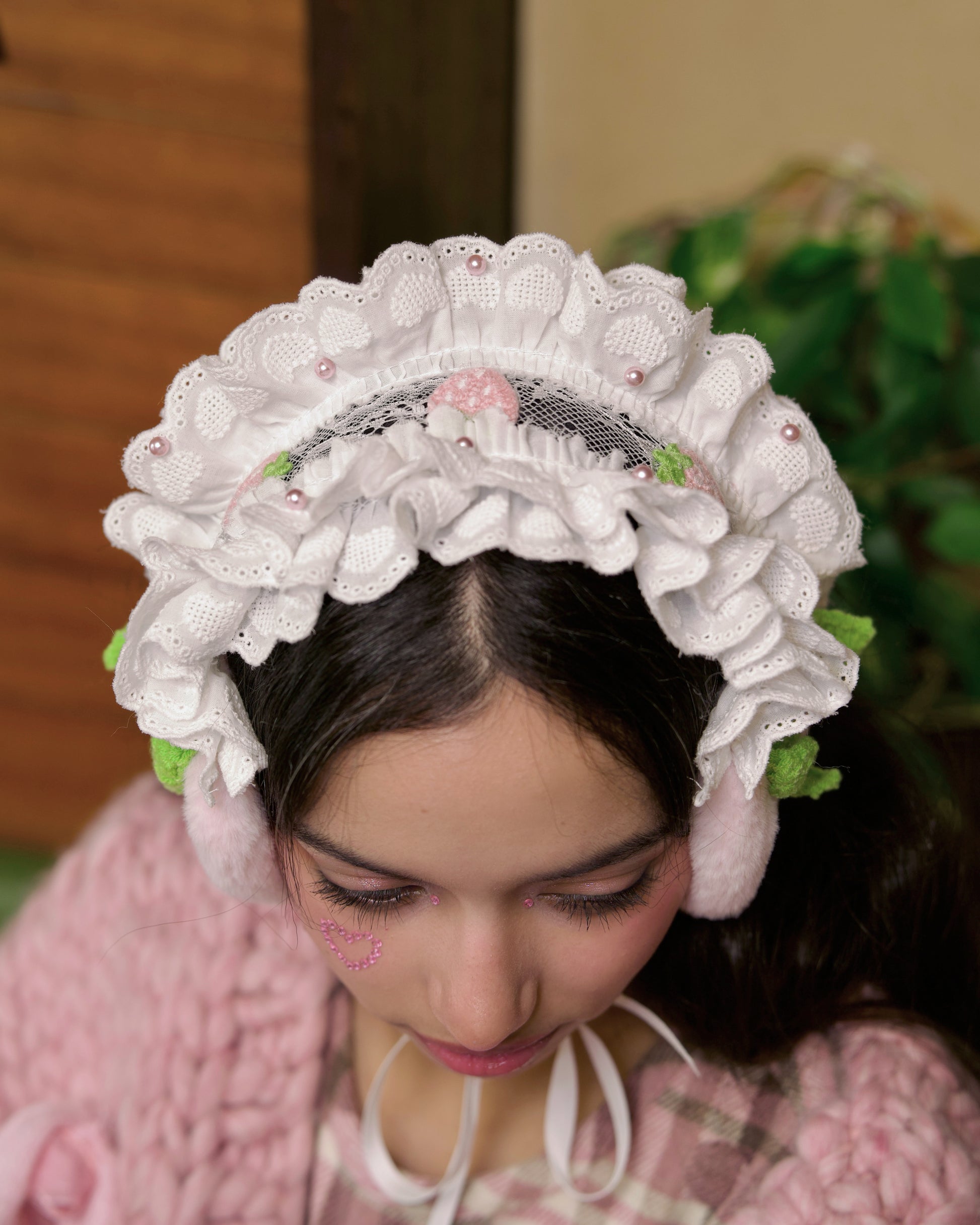 Our Strawberry Shortcake Ear Warmers are the perfect cosy accessory to add a sweet and whimsical touch to your winter looks. Designed with soft ruffled frills, delicate lace details, and adorable strawberry accents, these ear warmers bring a charming, storybook finish to any outfit. The plush ear panels gently cover the ears to help keep them warm and comfortable on colder days. Finished with ribbon ties, they can be tied under the chin for a secure and adjustable fit.
