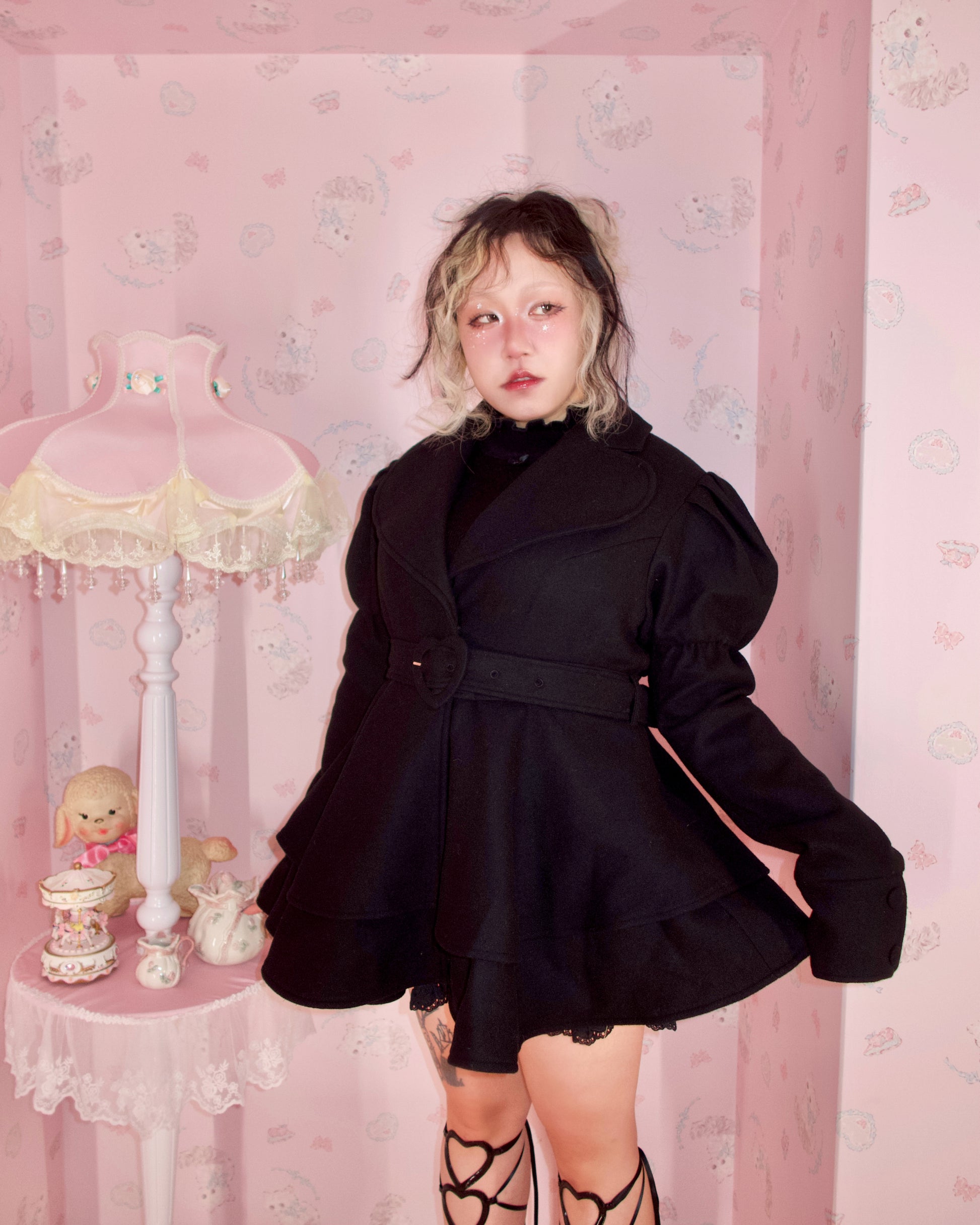 Wrap yourself in warmth and elegance with the Sugarplum Heart Coat, crafted from soft and smooth 100% wool. It features a heart yoke on the back, soft puff sleeves and a sculpted waist adorned with a heart-shaped belt buckle. The wide lapel collar adds a refined touch, while the coat’s flared skirt silhouette brings just the right amount of drama and charm.