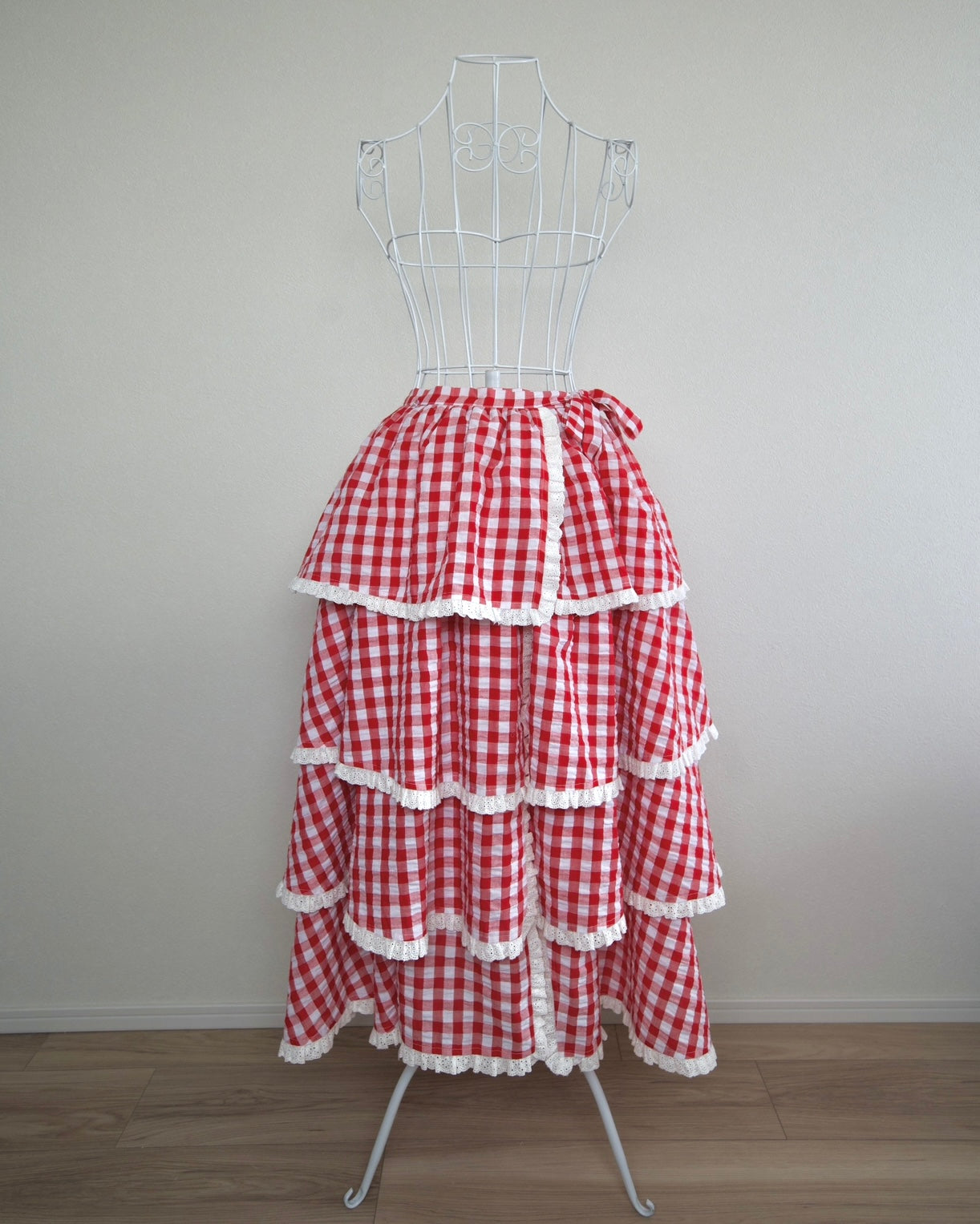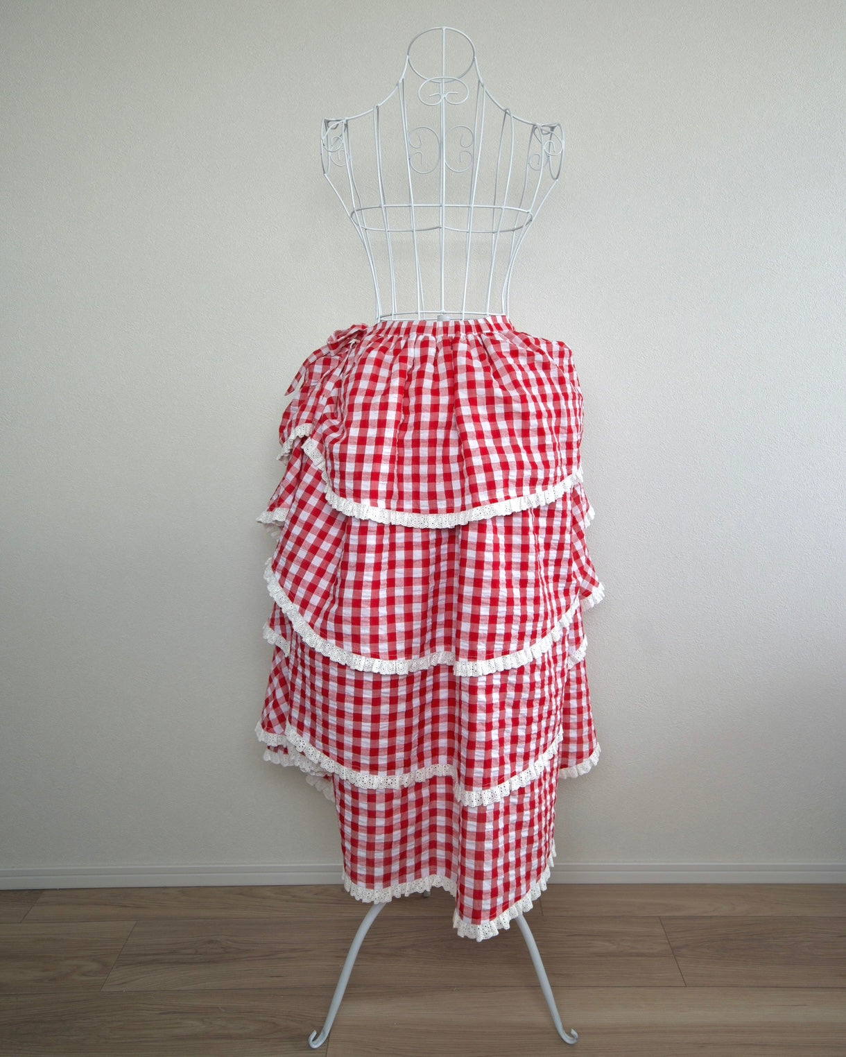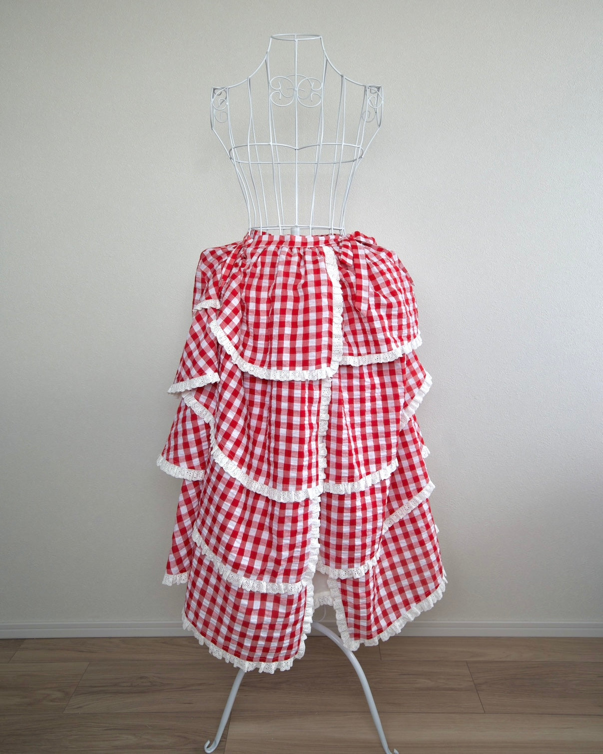A 100% cotton wrap skirt with two waist button holes, a ribbon to tie and an elasticated waist for comfortable and adjustable fit. The skirt features several layers and can be worn as is or, with the adjustable straps pulled through discreet button holes on the sides, can be pulled up and separated for extra dimension. Comes with a 100% cotton petticoat that protects you from being exposed by the front slit and can be worn with other items! This is the red gingham check variant. 🎀