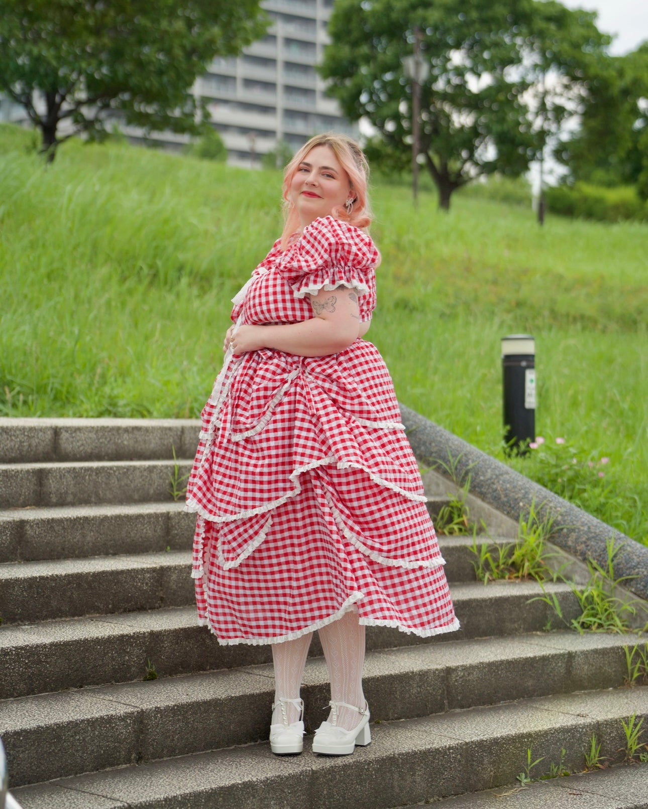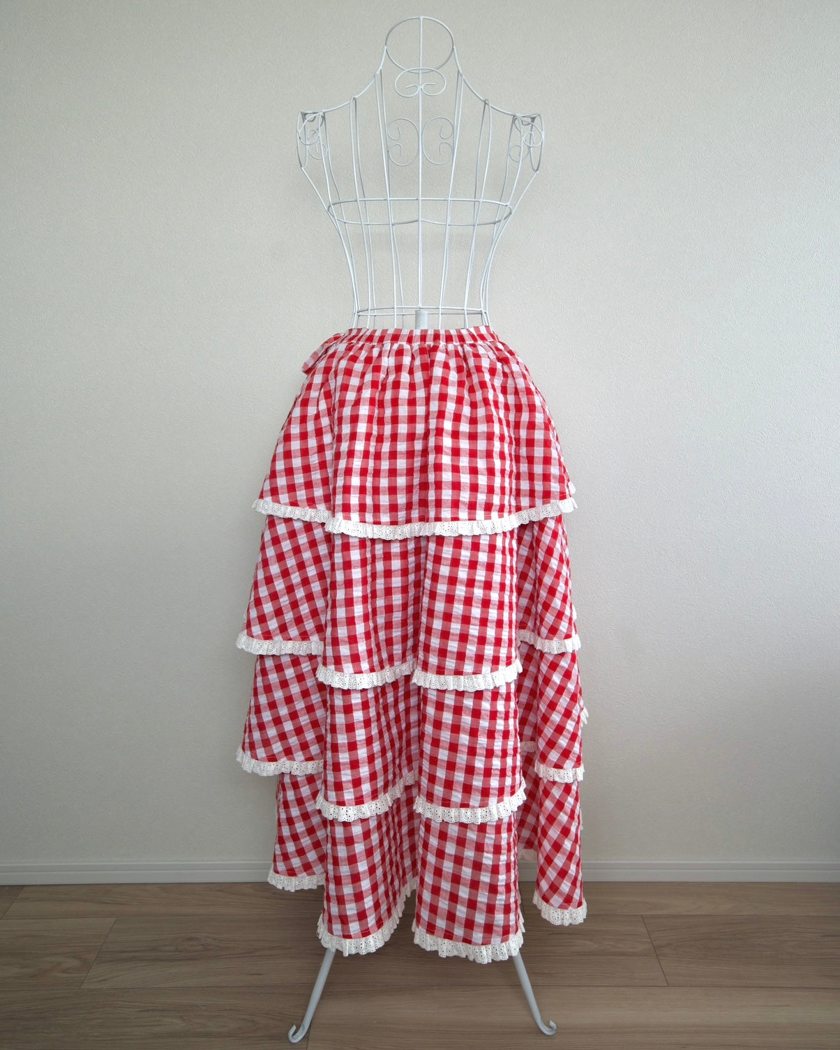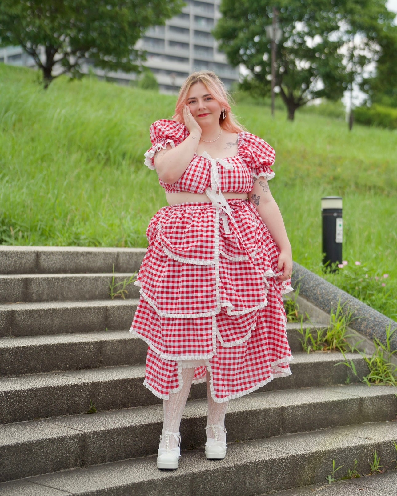 A 100% cotton wrap skirt with two waist button holes, a ribbon to tie and an elasticated waist for comfortable and adjustable fit. The skirt features several layers and can be worn as is or, with the adjustable straps pulled through discreet button holes on the sides, can be pulled up and separated for extra dimension. Comes with a 100% cotton petticoat that protects you from being exposed by the front slit and can be worn with other items! This is the red gingham check variant. 🎀